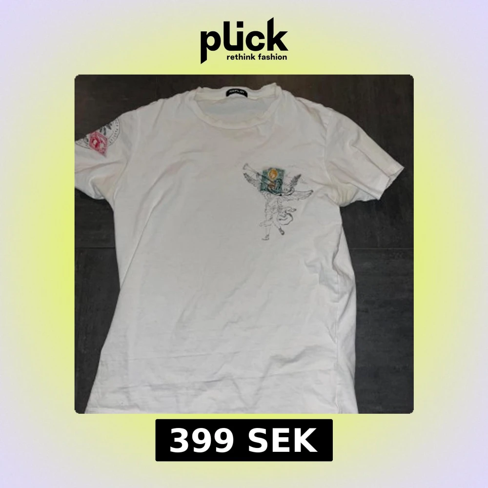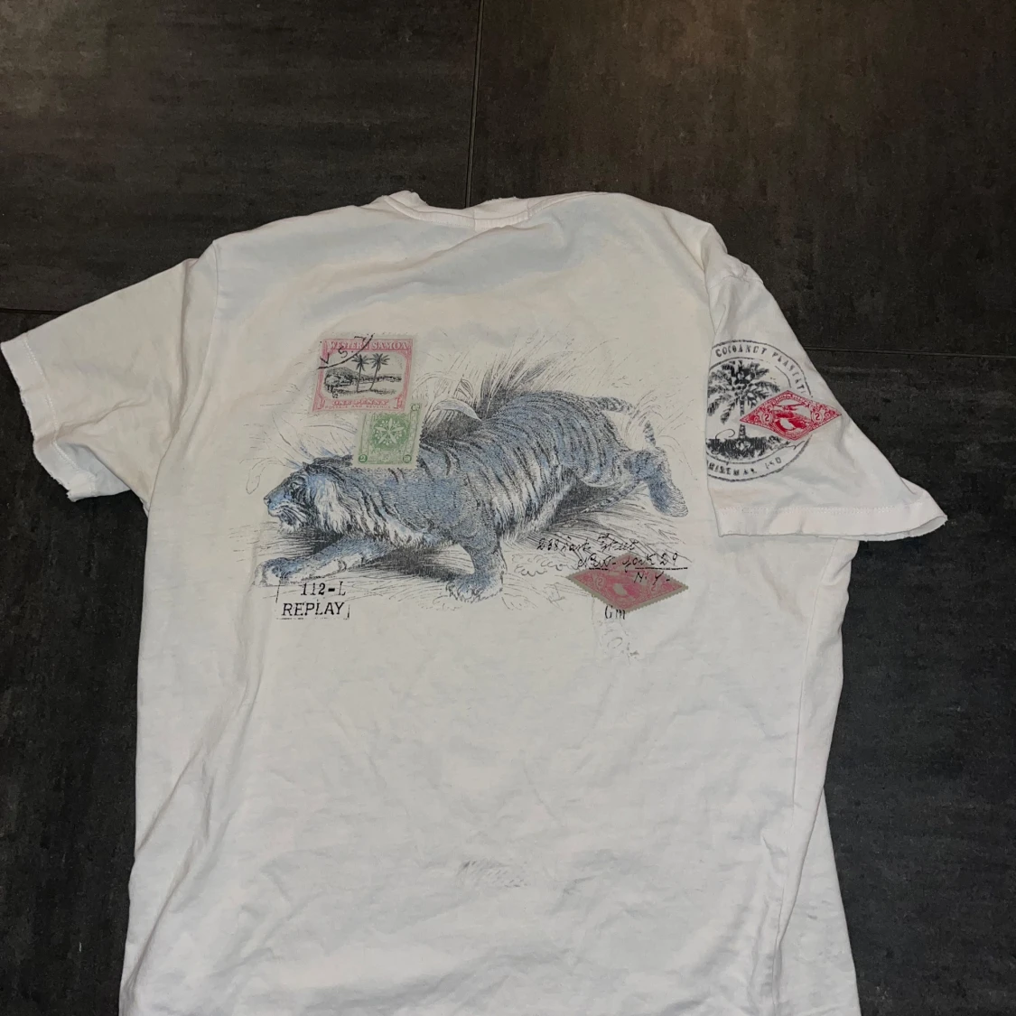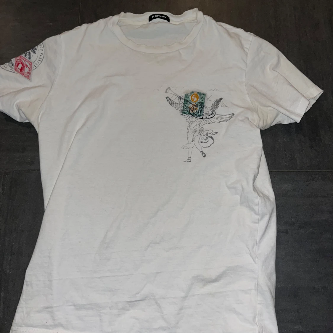 Snygg vit t-shirt från Replay med unikt tryck. Använt ett fåtal gånger men inget synligt fel på tröjan. Nypris är 800 kr. Skriv för fler bilder. Tröjan är liten i storleken, jag har vanligtvis M i tröjor så denna passar även det.