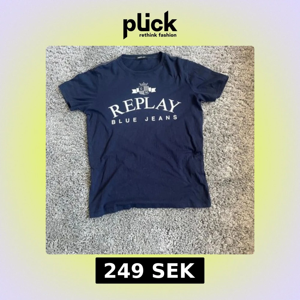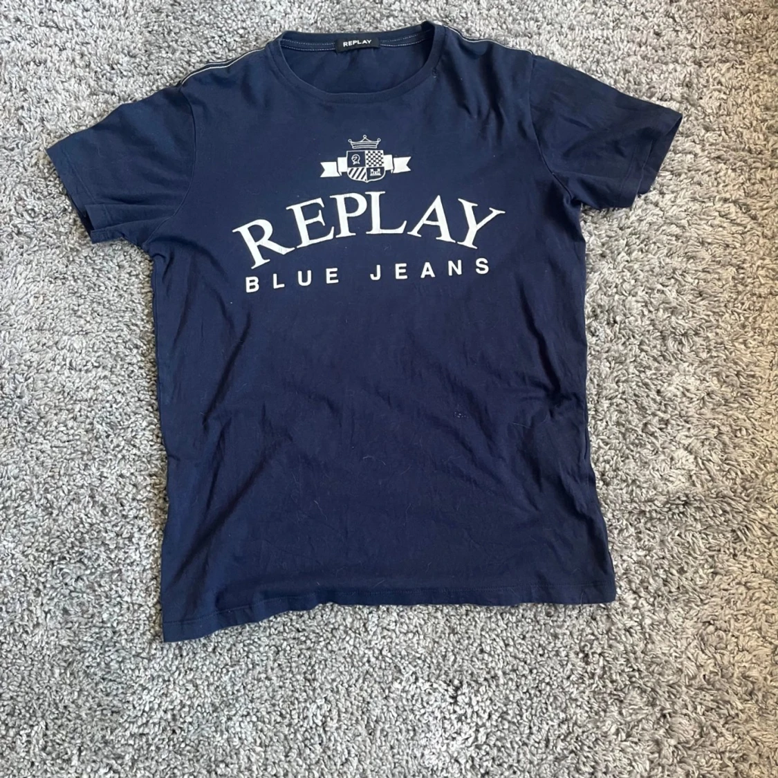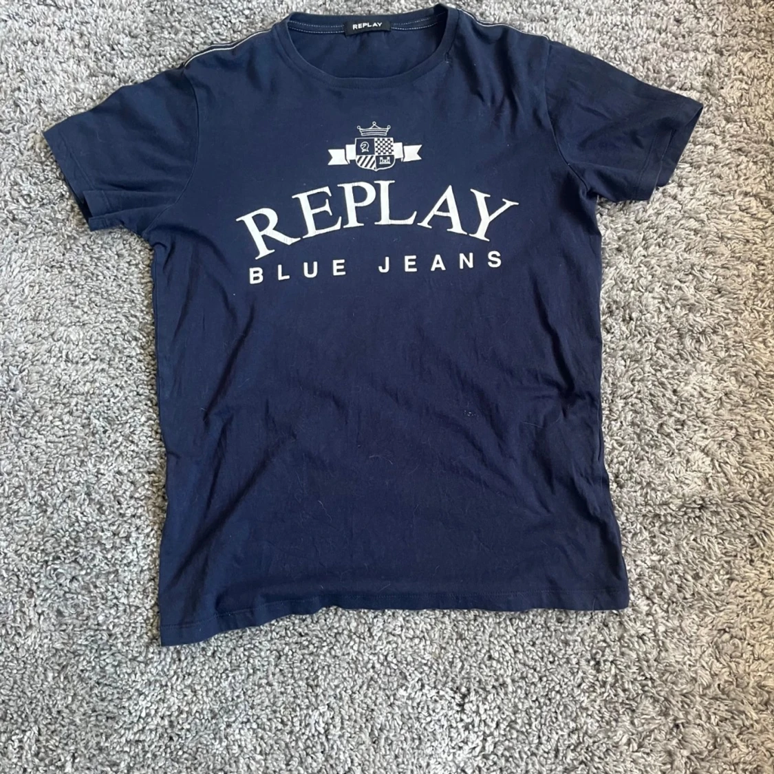 Snygg mörkblå t-shirt från Replay med tryck 'Replay Blue Jeans' i vitt på framsidan. Perfekt för en casual look. Kortärmad och tillverkad i mjukt material för extra komfort.