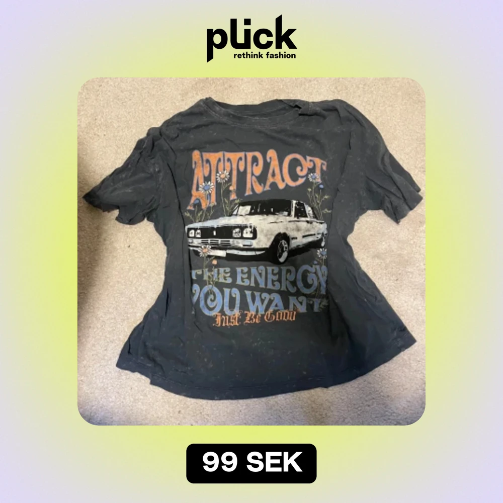 Jättecool svart/grå t-shirt med ett vintageinspirerat tryck av en bil och texten 'Attract the energy you want'. T-shirten har korta ärmar och är oversized i passformen. Perfekt till hösten!