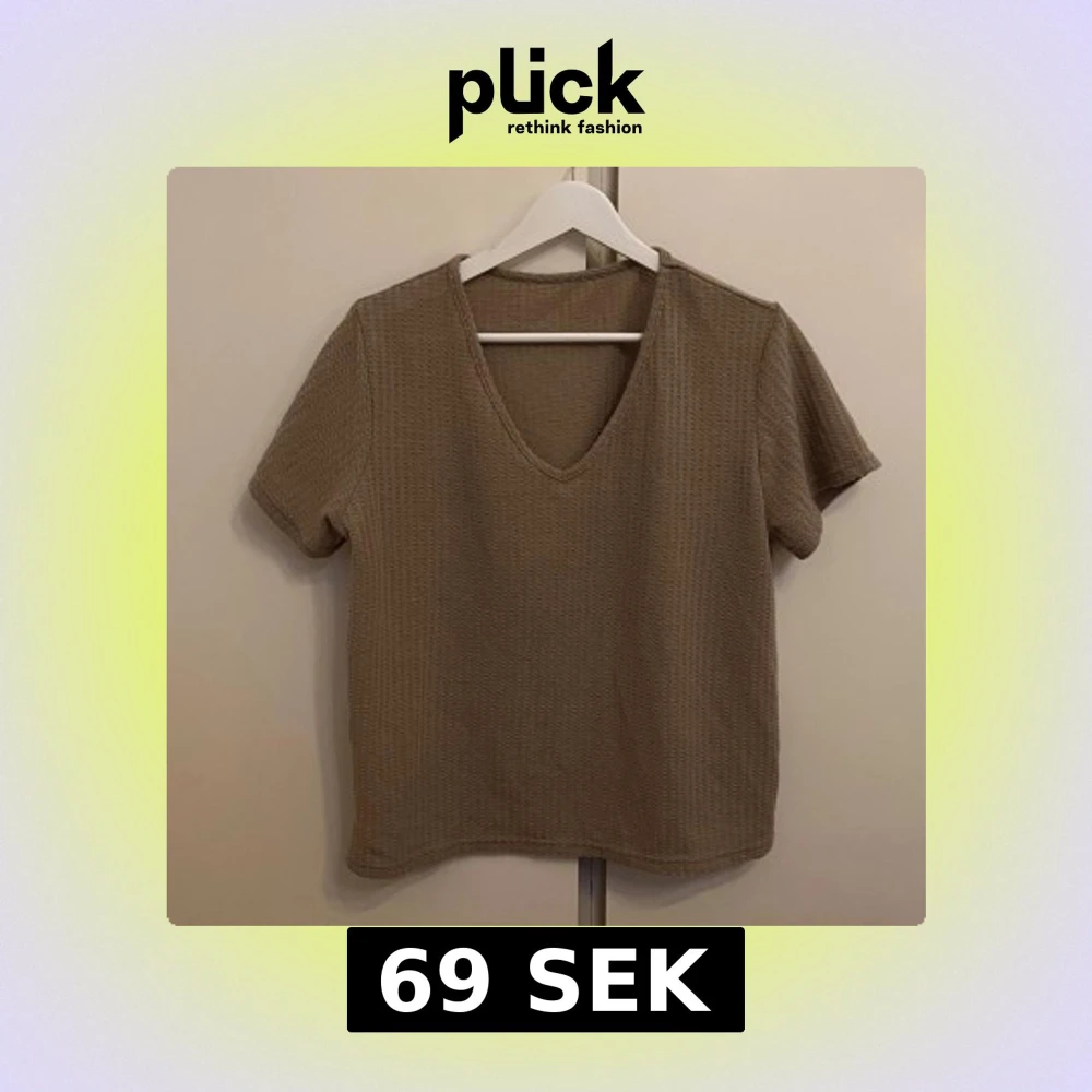Säljer en stilren ljusbrun t-shirt med v-ringning och korta ärmar. Den har en ribbad textur som ger en extra touch till designen. Perfekt för en avslappnad look.