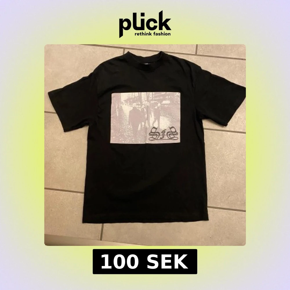 Säljer en svart t-shirt med ett stort tryck på framsidan som föreställer en grupp män och texten 'SFS’, Baksidan har en mindre text med samma stil. Perfekt för en avslappnad stil. Den är i nyskick och storlek S