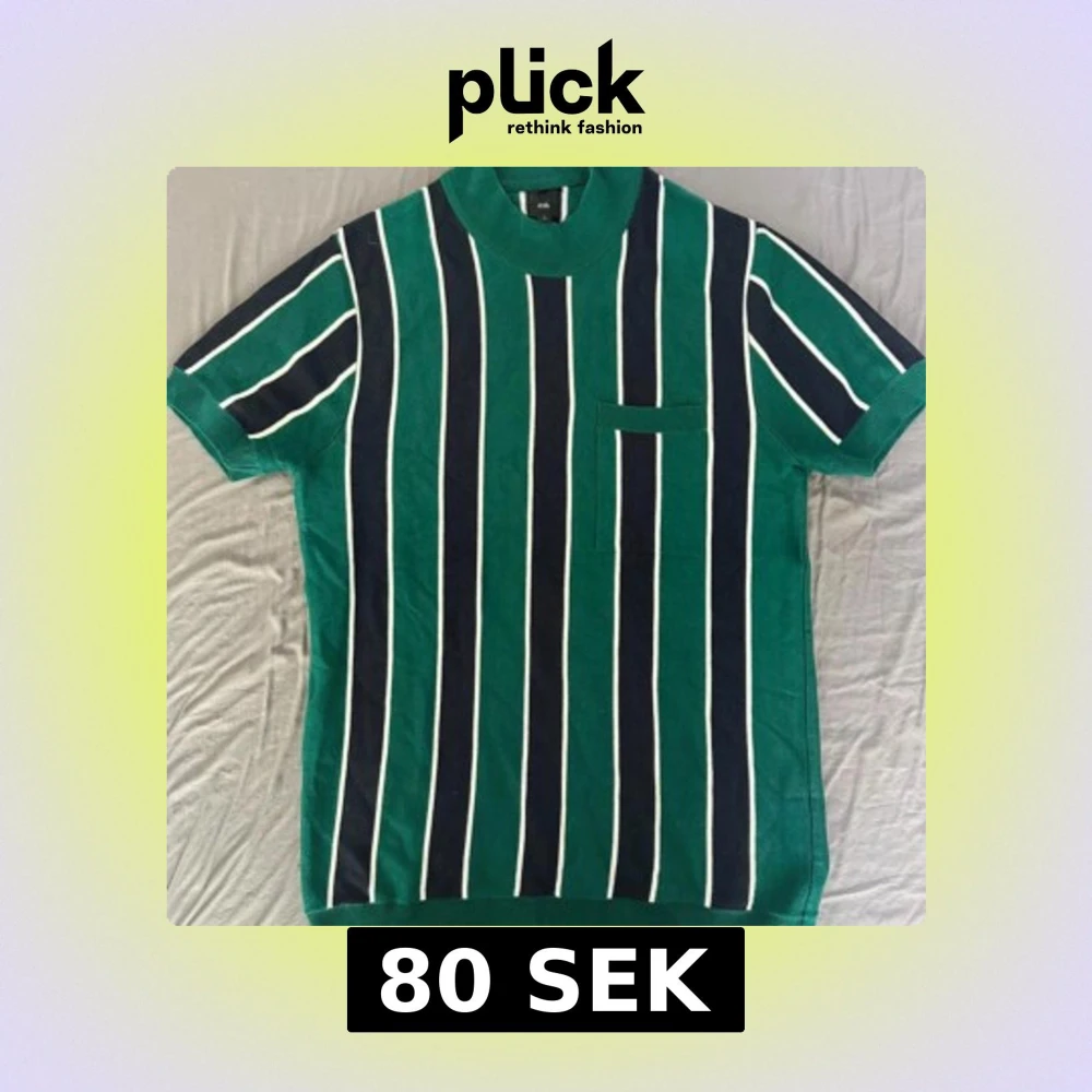 Snygg t-shirt från River Island i storlek M med gröna och marinblå vertikala ränder och vita detaljer. Modellen har korta ärmar, ribbad krage och en liten bröstficka. Materialet känns mjukt och är bomull. Använd ett par gånger