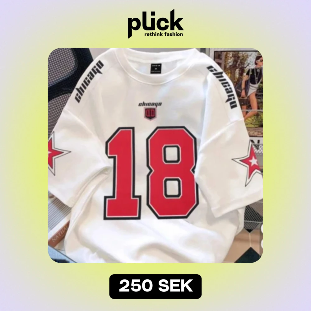 Säljer en vit t-shirt med tryck från Chicago. Den har stora röda siffror '18' på framsidan och svarta textdetaljer på axlarna. På ärmarna finns röda stjärnor med vita konturer. Perfekt för en sportig look eller casual vardagsstil. T-shirten är i nyskick och gjord av bomull.