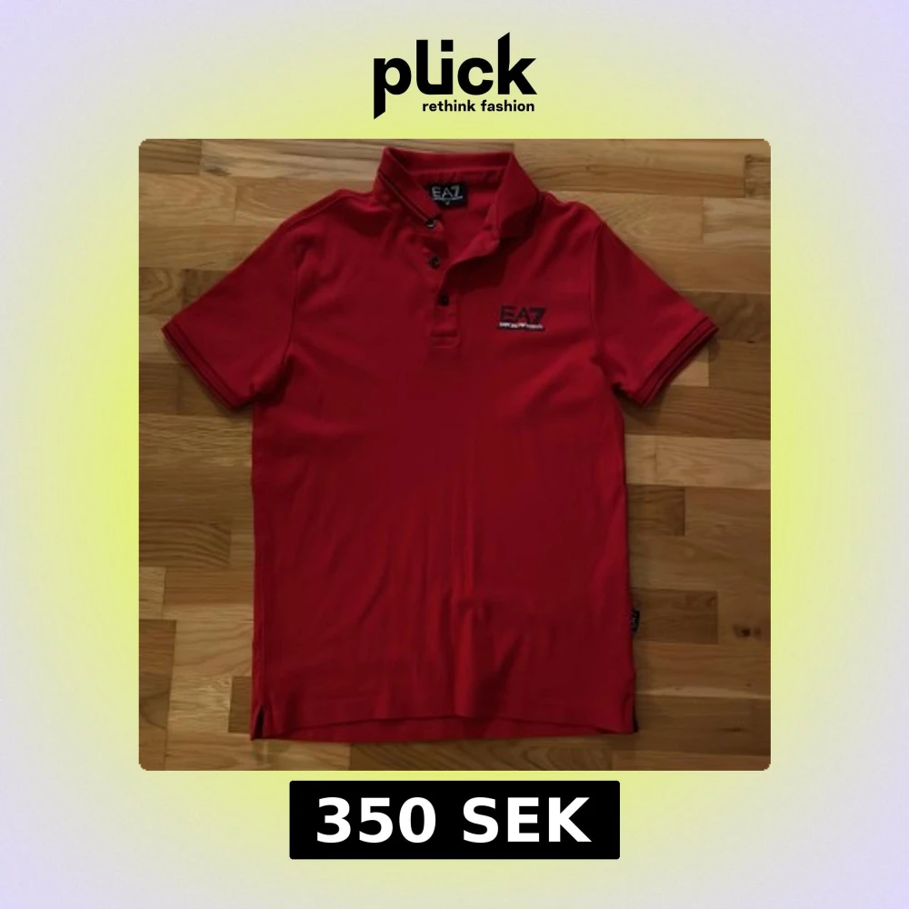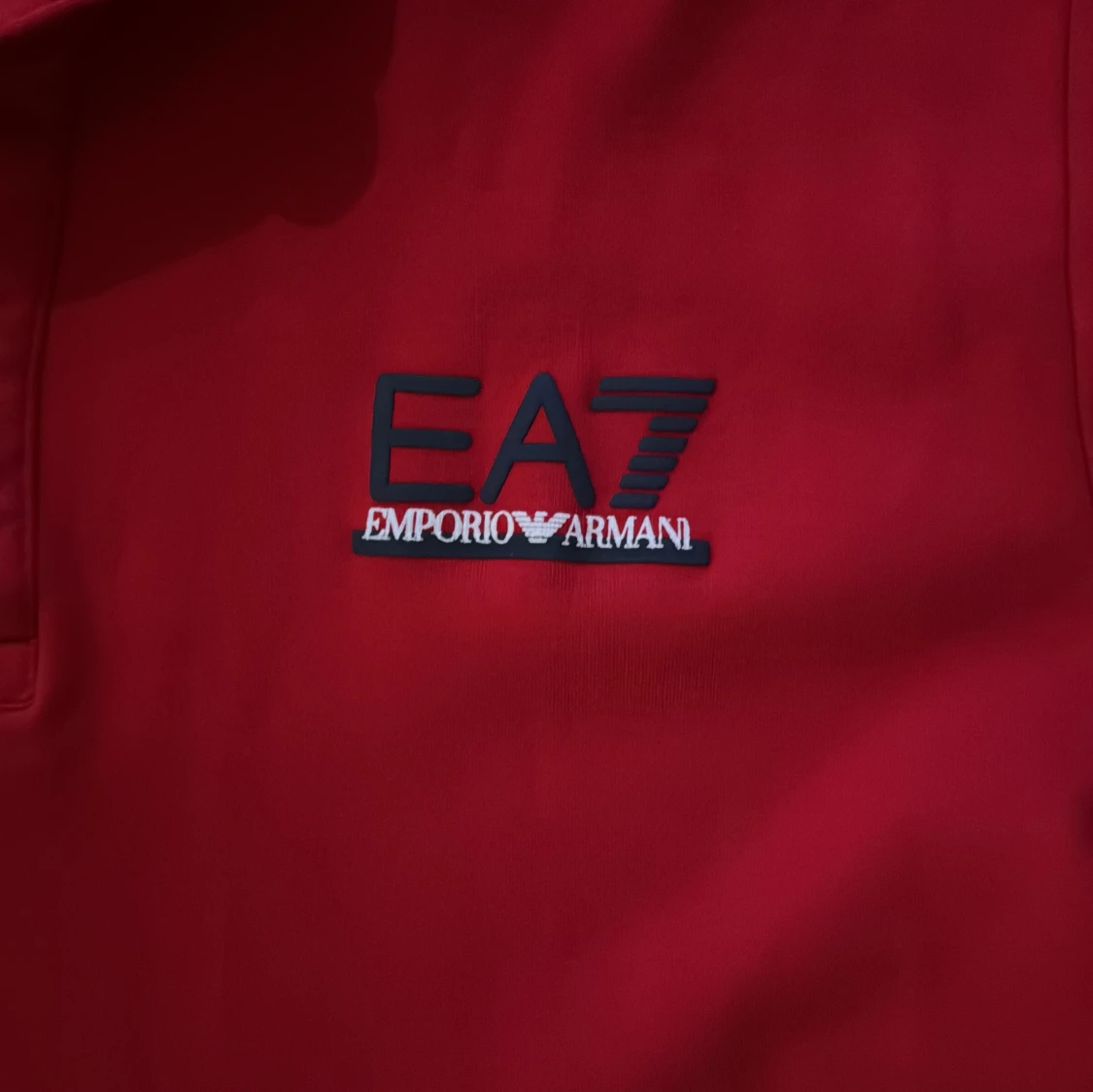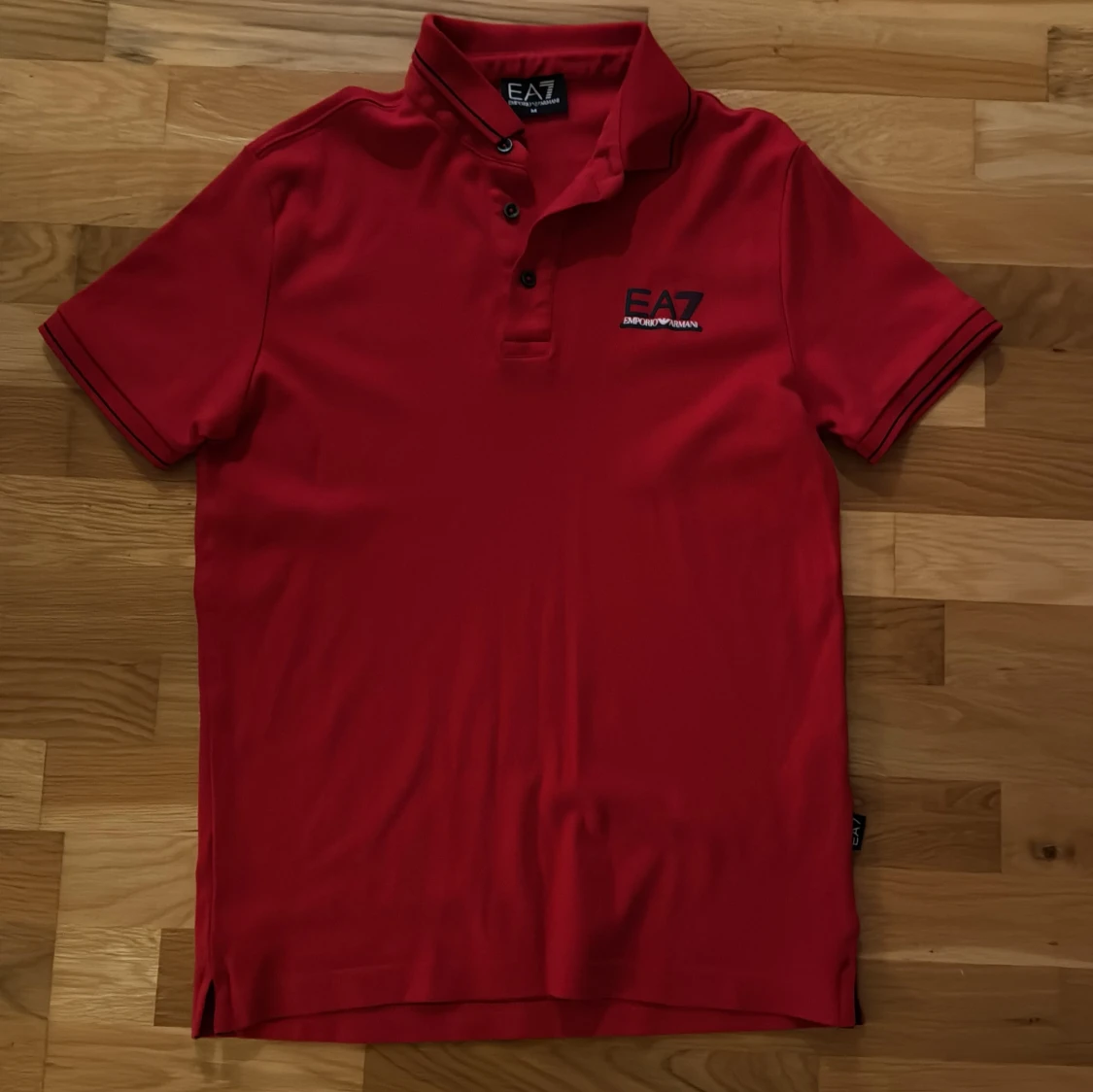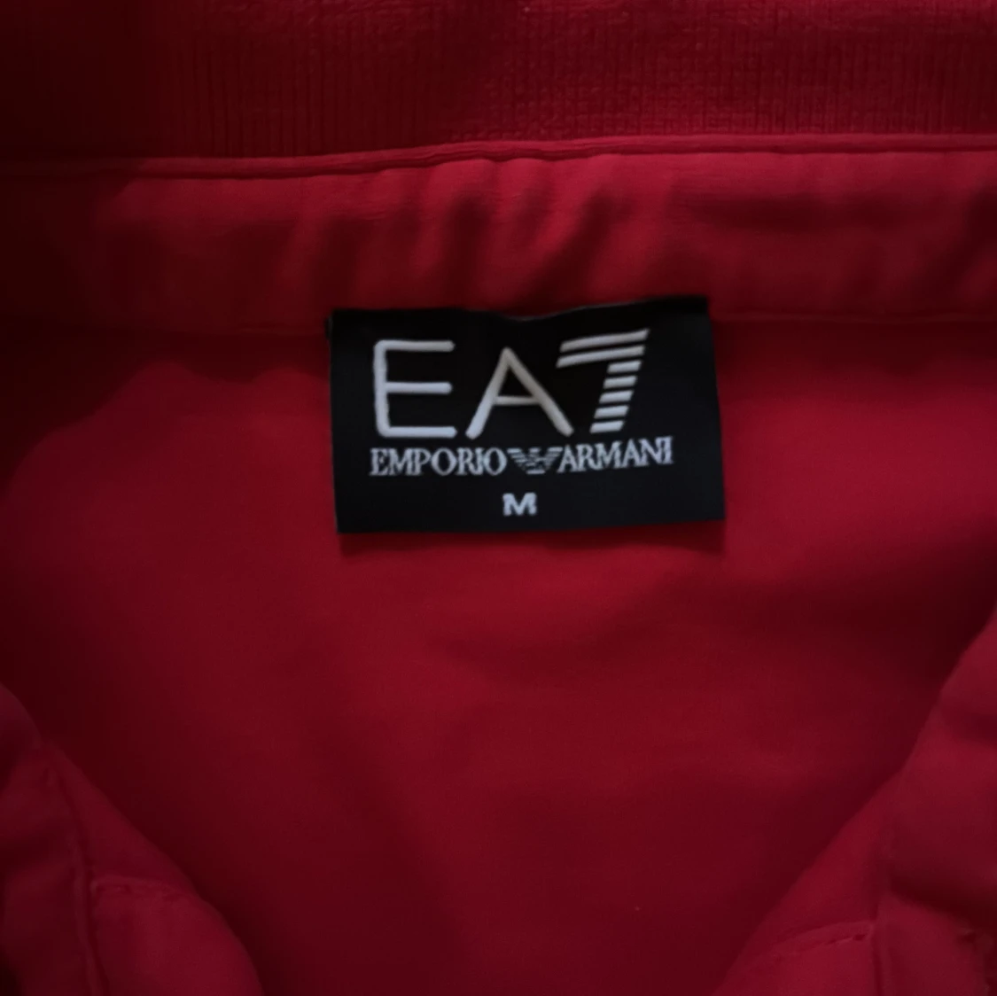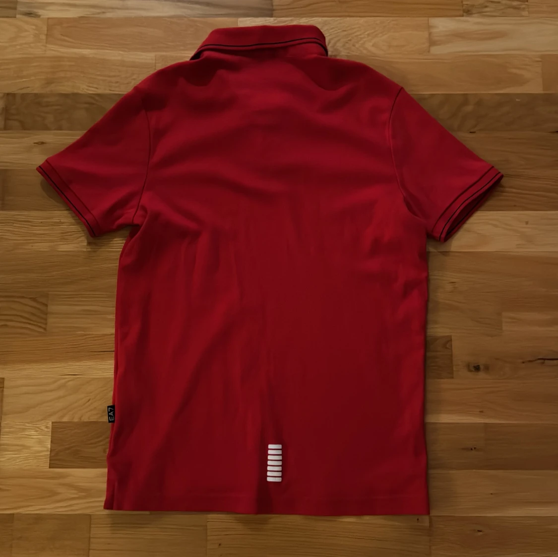 Snygg röd pikétröja från Emporio Armani med EA7-logga på bröstet. Aldrig använd tröjan! Tröjan har en klassisk krage och knappar framtill. Perfekt för en stilren look. Hör av dig!