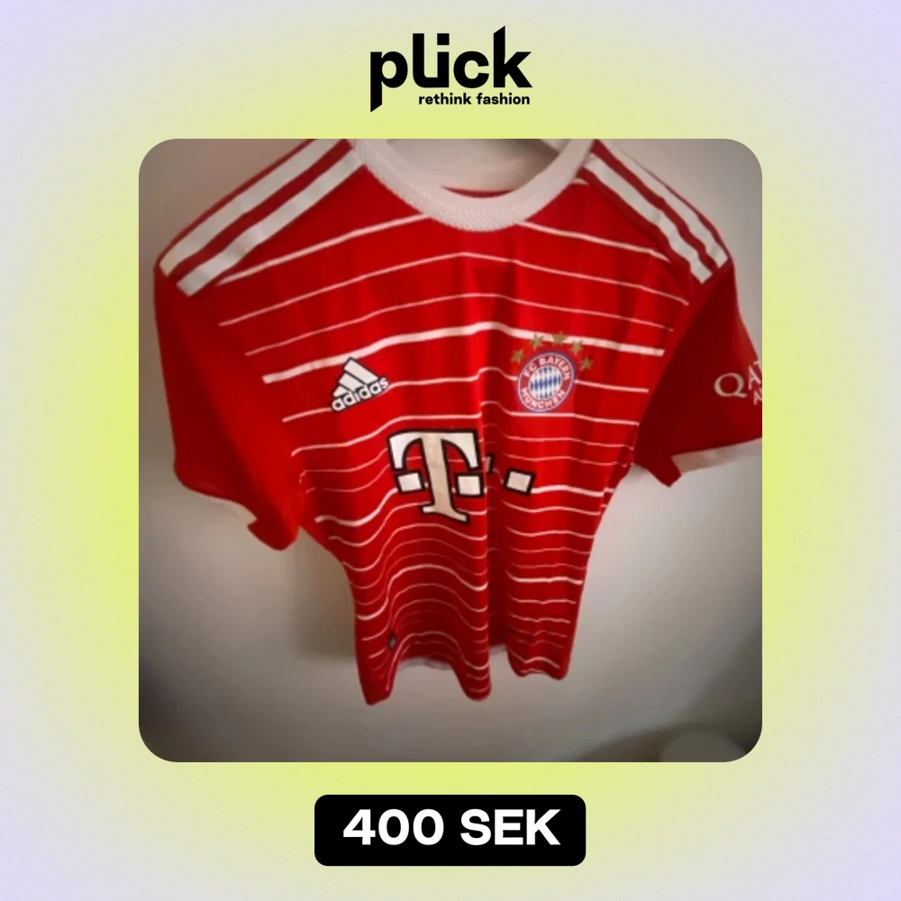 Säljer en snygg röd Bayern München fotbollströja från Adidas. Tröjan har vita ränder och klubbens emblem på bröstet. Den är kortärmad och har sponsorloggor på framsidan och ärmarna. Perfekt för alla Bayern-fans!