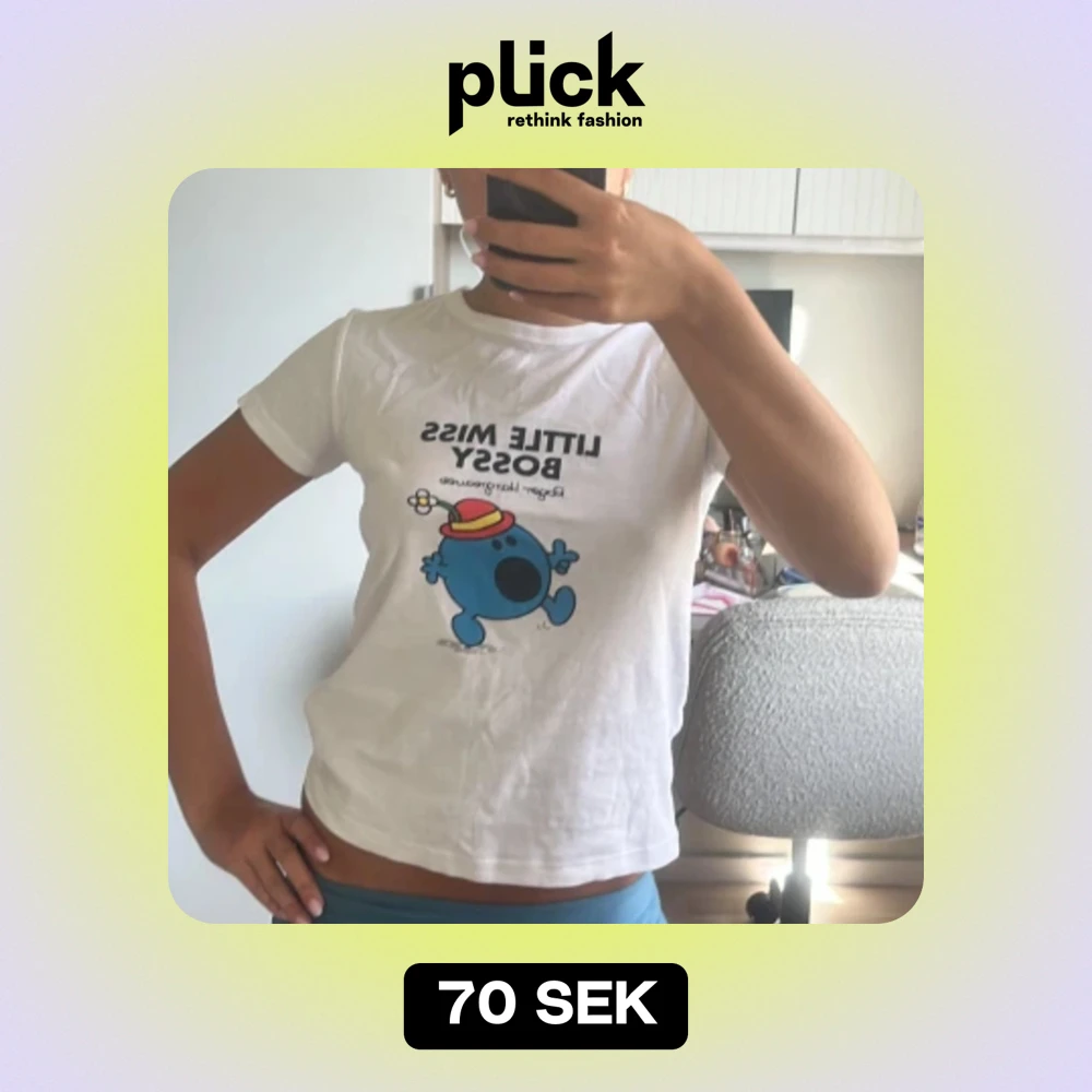 Säljer en superfin vit t-shirt med ett tryck av Little Miss Bossy i blått och rött. T-shirten är kortärmad och har en normal passform. Perfekt för en avslappnad look eller som en rolig detalj i din outfit!