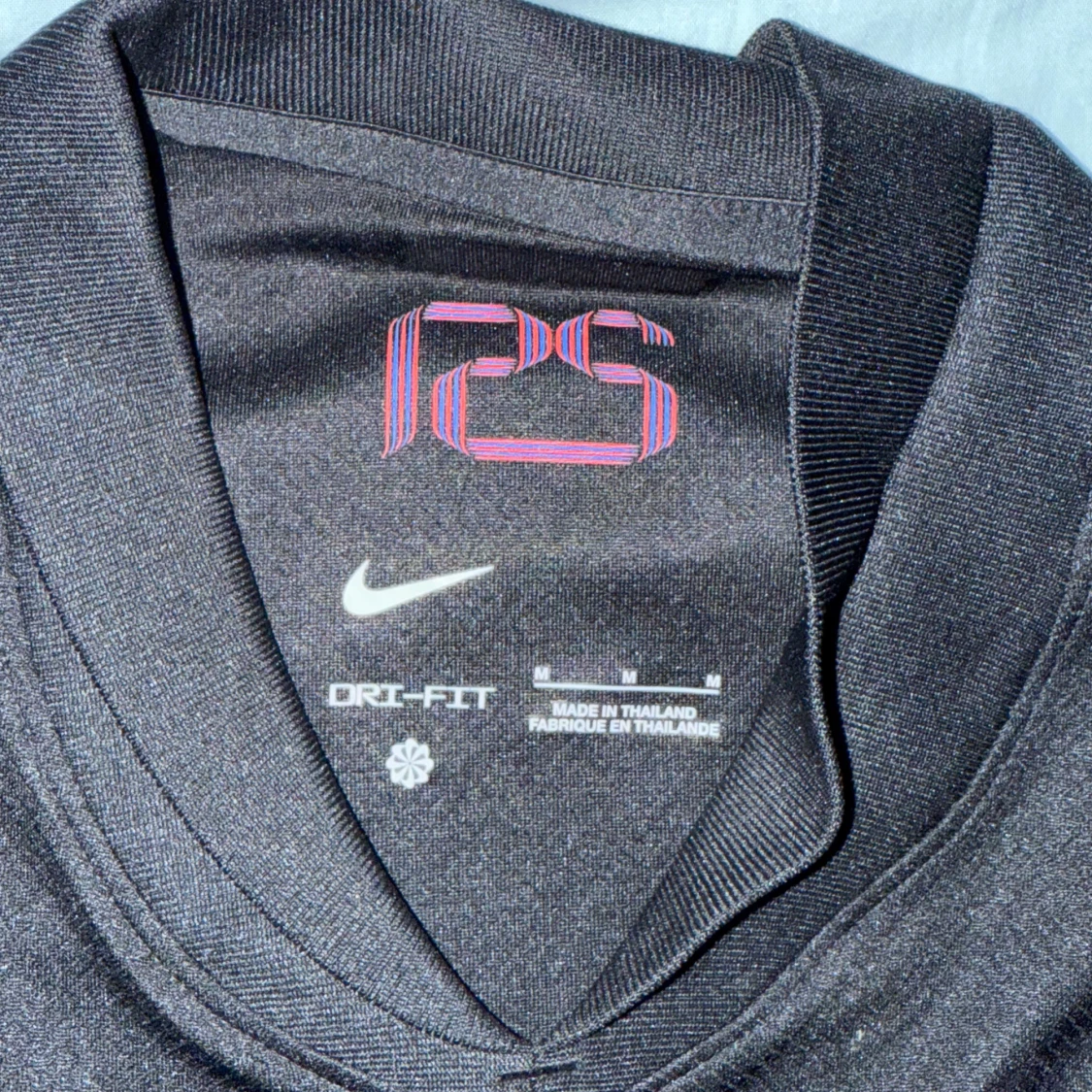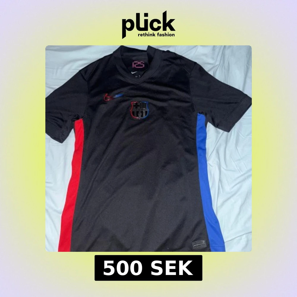 Snygg svart FC Barcelona fotbollströja från Nike med Dri-FIT-material. Tröjan har klubbmärke på bröstet, röda och blå sidopaneler samt broderad Nike-logga. Perfekt för dig som vill sticka ut på planen eller visa ditt stöd för Barca.äkta köpte för 1250kr