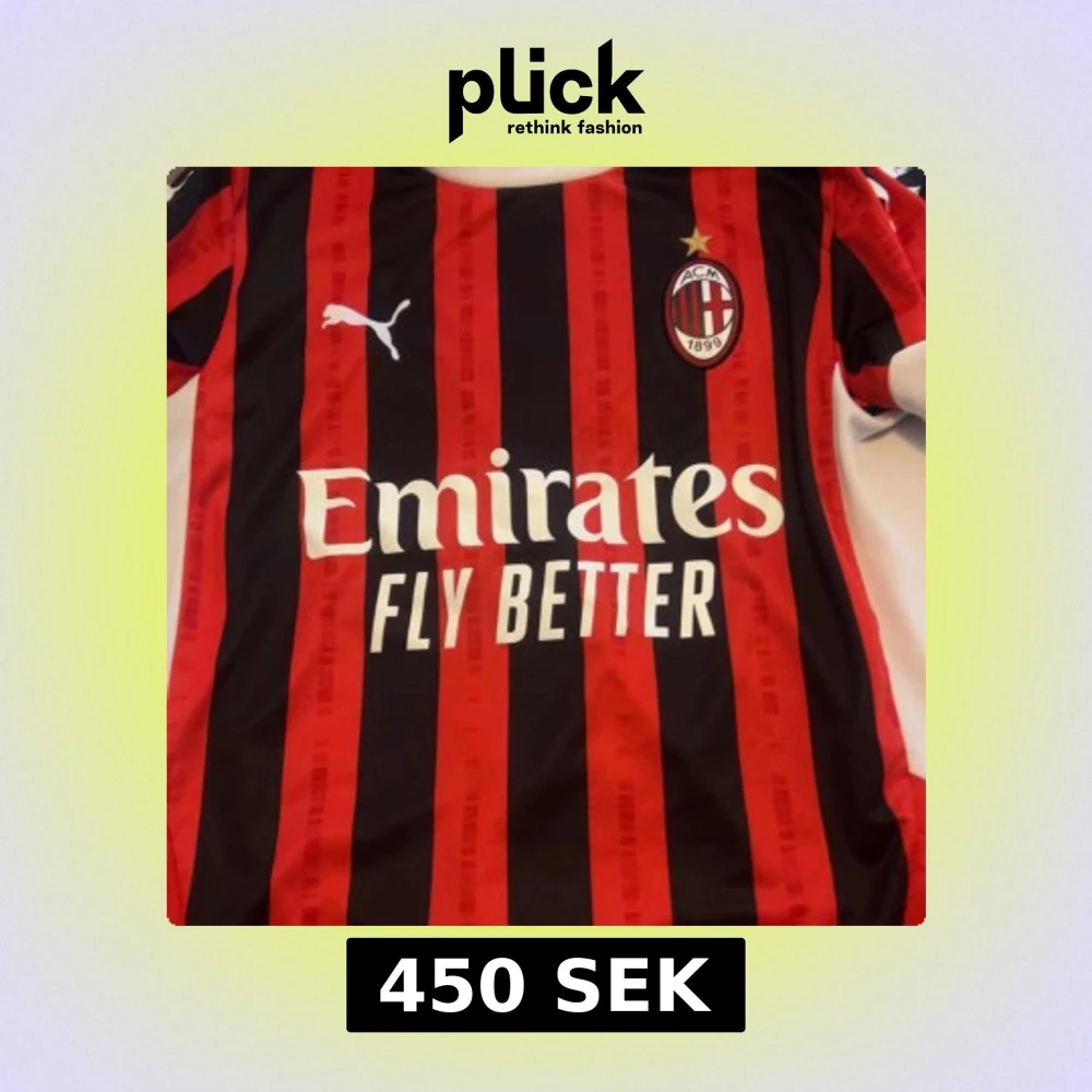 Säljer en snygg AC Milan fotbollströja från Puma i röd och svart randigt mönster. Tröjan har korta ärmar och klubbens emblem på bröstet. Perfekt för alla fotbollsfans som vill visa sitt stöd för laget!