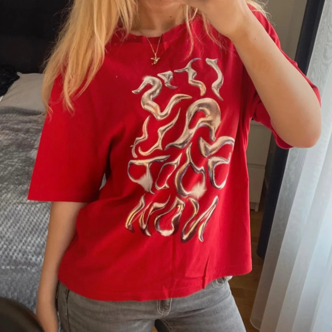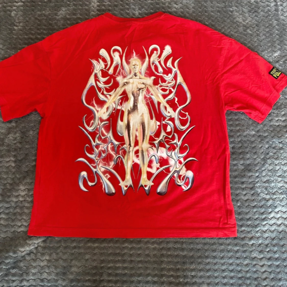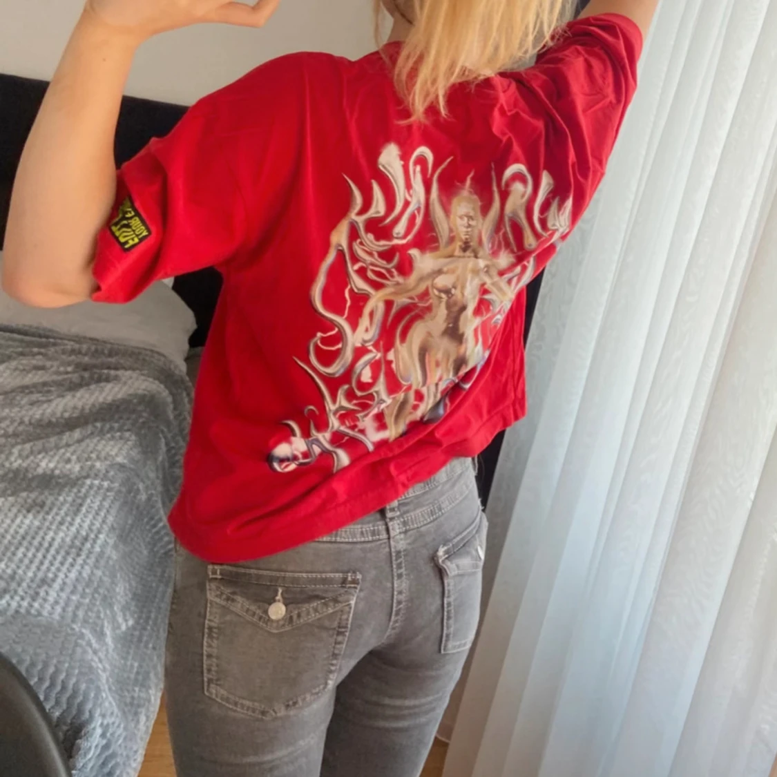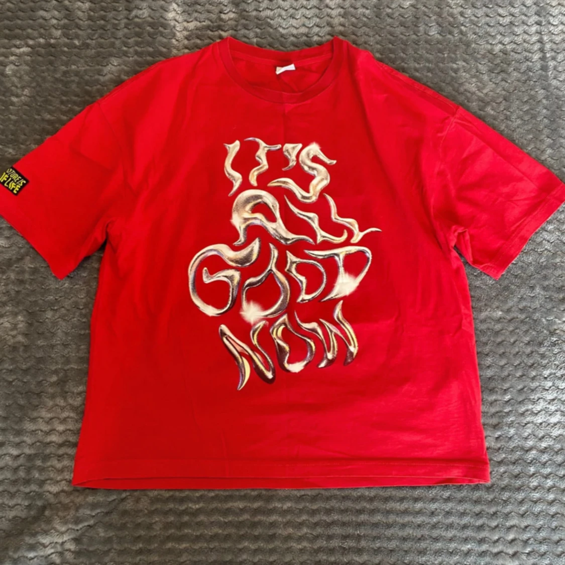 Röd t-shirt med coolt tryck fram och bak, texten 'IT'S ALL GOOD NOW' på framsidan och futuristiskt motiv på ryggen. Oversized passform, korta ärmar och rund hals. Patch med logga på ärmen. Perfekt statement-plagg för dig som gillar unika prints. Tycker det ger ”The weeknd” vibes!!