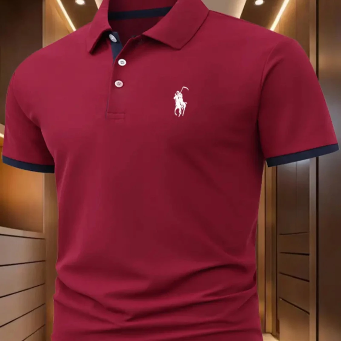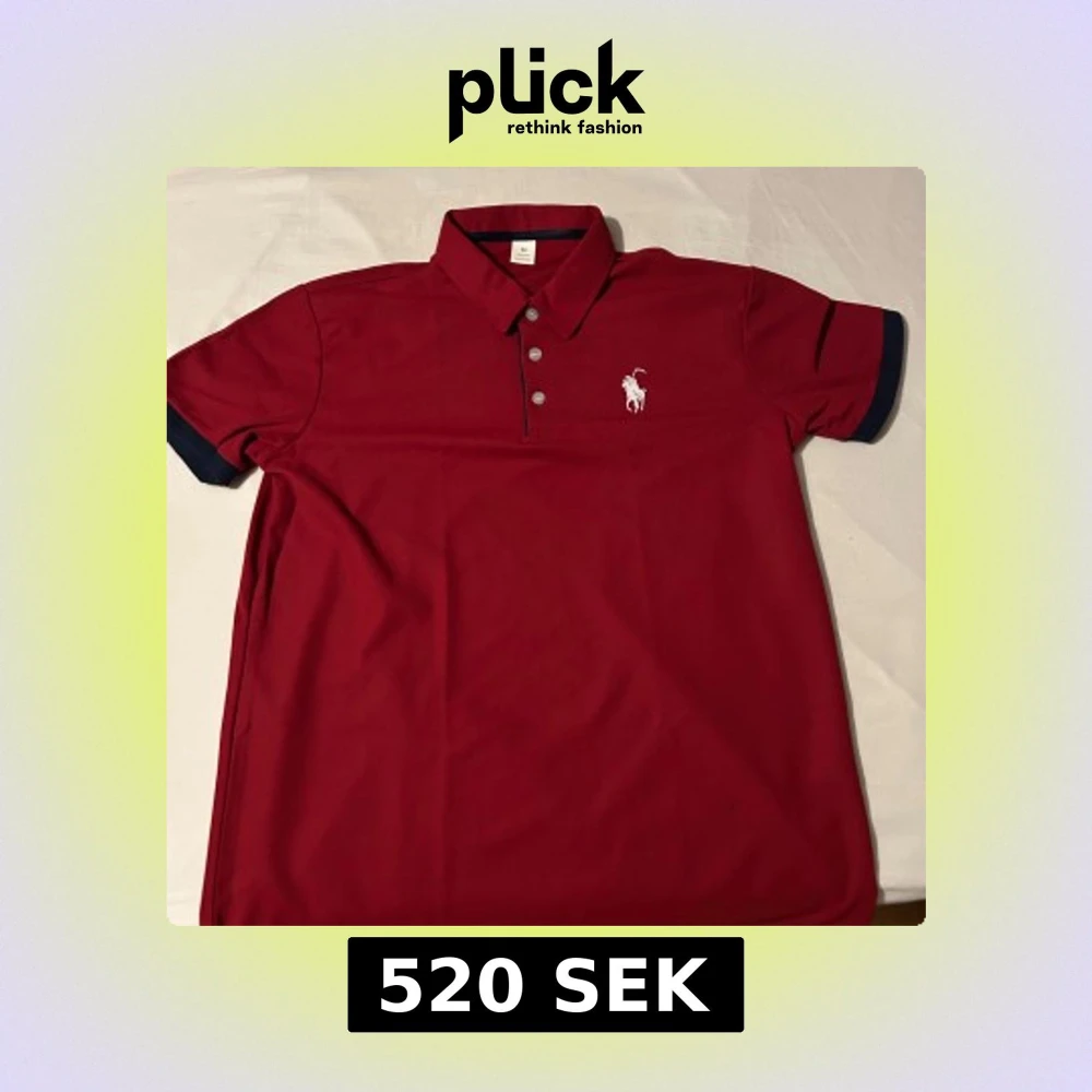 Snygg röd pikétröja från Polo Ralph Lauren med klassisk krage och tre knappar framtill. Tröjan har korta ärmar med mörkblå kant och den ikoniska vita polospelaren broderad på bröstet. Tillverkad i 100% polyester. Har aldrig använt då den var för liten.