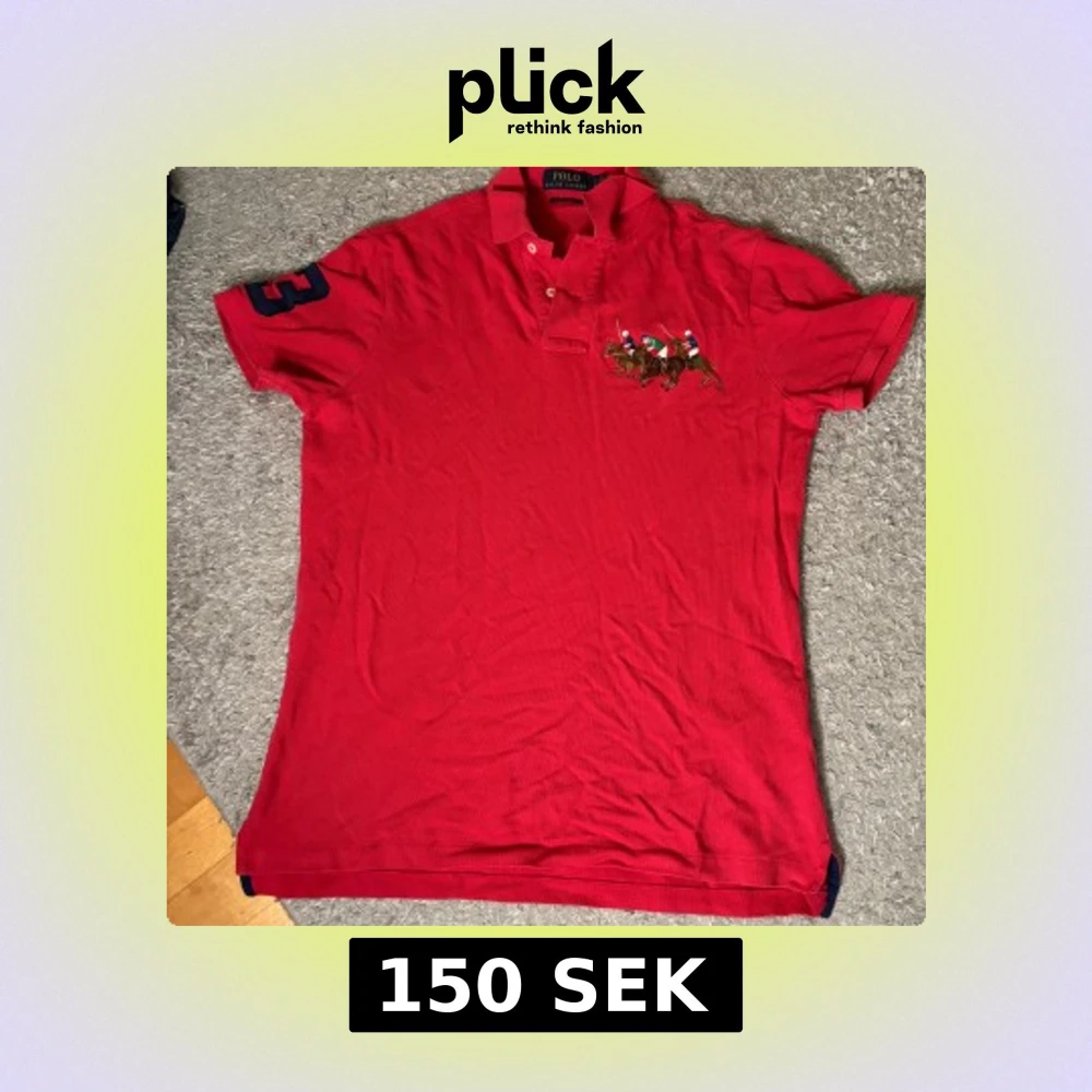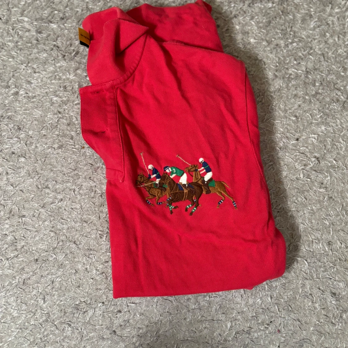 Röd pikétröja från Polo Ralph Lauren med broderat polospel-motiv på bröstet och en stor blå siffra 3 på ärmen. Klassisk krage med knappar och korta ärmar. Perfekt för en sportig och stilren look.