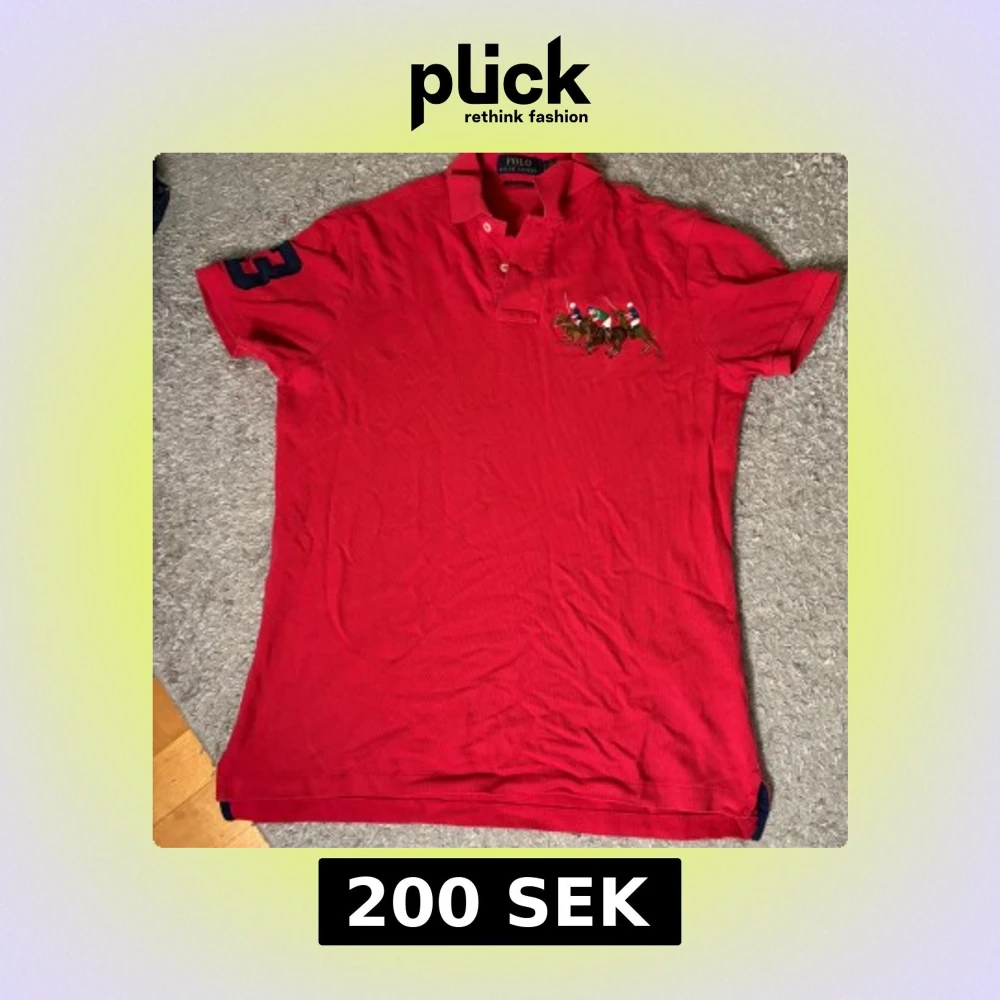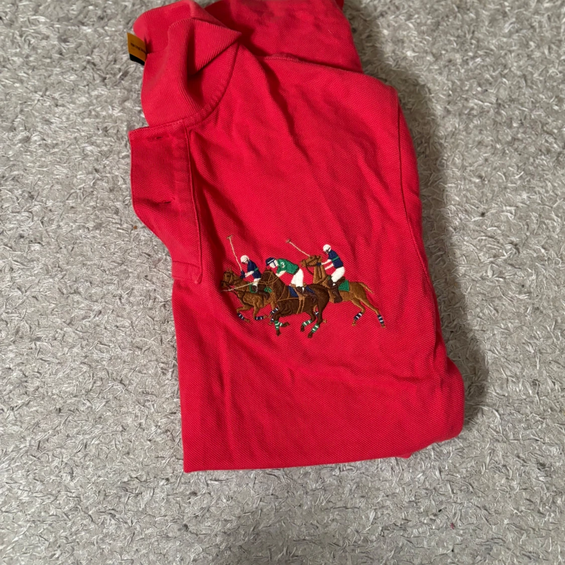 Snygg röd pikétröja från Polo Ralph Lauren med broderat polospel-motiv på bröstet och en stor blå siffra 3 på ärmen. Klassisk krage med knappar och korta ärmar. Perfekt för en sportig och stilren look.