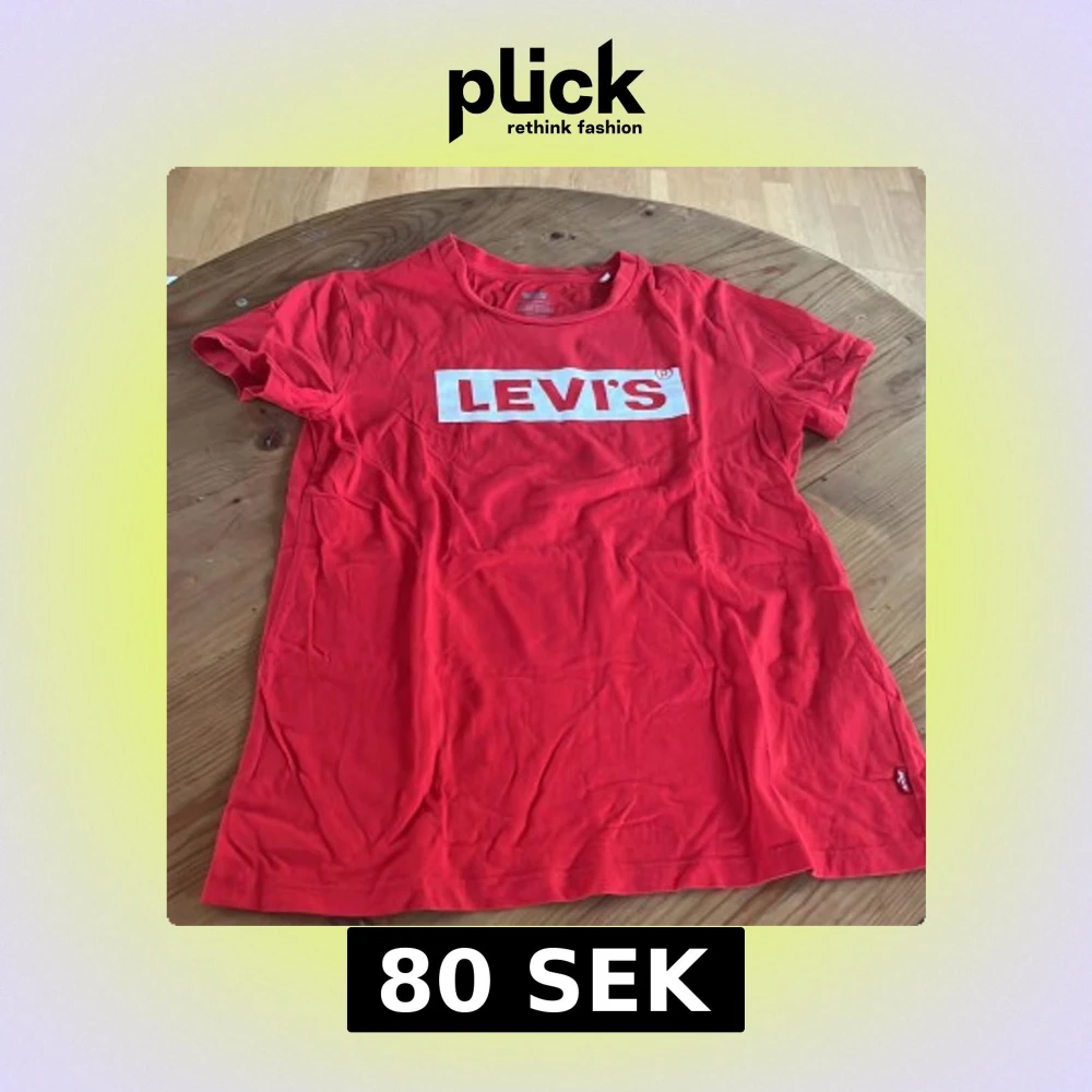 Säljer en klassisk röd t-shirt från Levi's med deras ikoniska logga tryckt i vitt på bröstet. T-shirten är kortärmad och perfekt för en avslappnad stil.