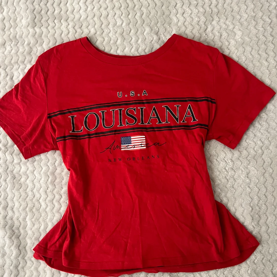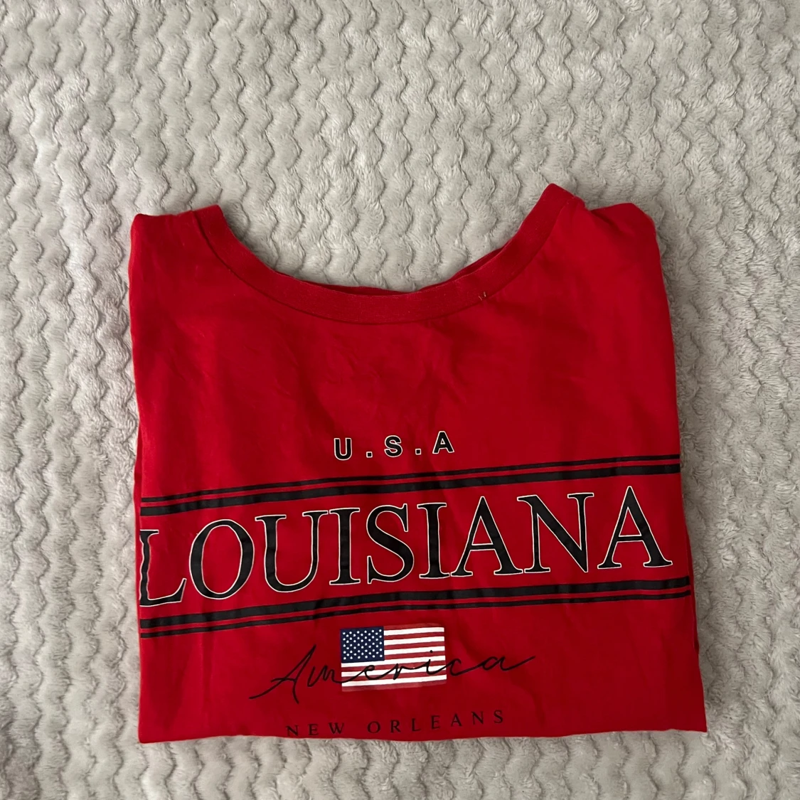 Snygg röd t-shirt med texten 'Louisiana' och en amerikansk flagga på framsidan. Perfekt för en avslappnad stil med korta ärmar och rund halsringning.