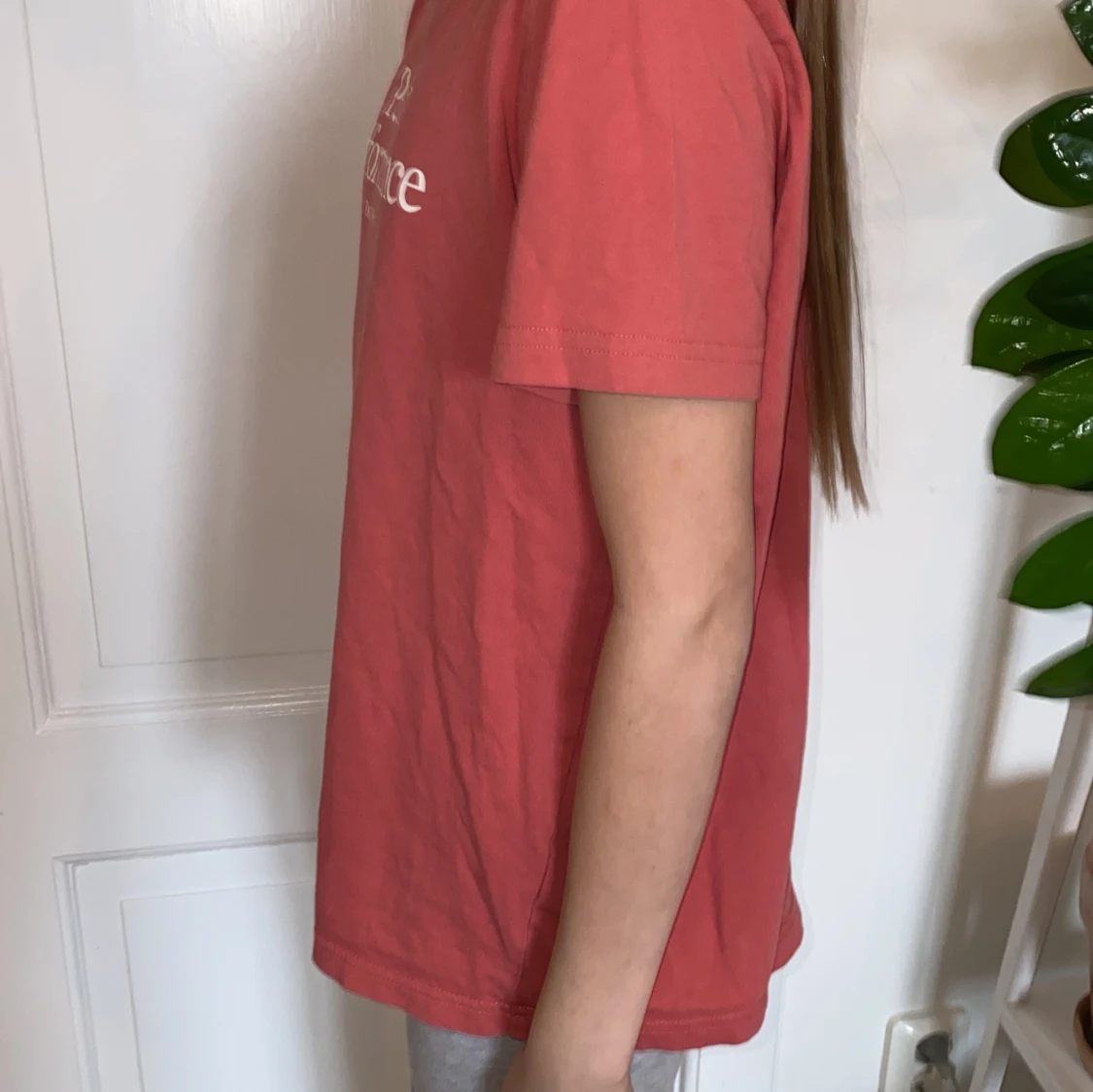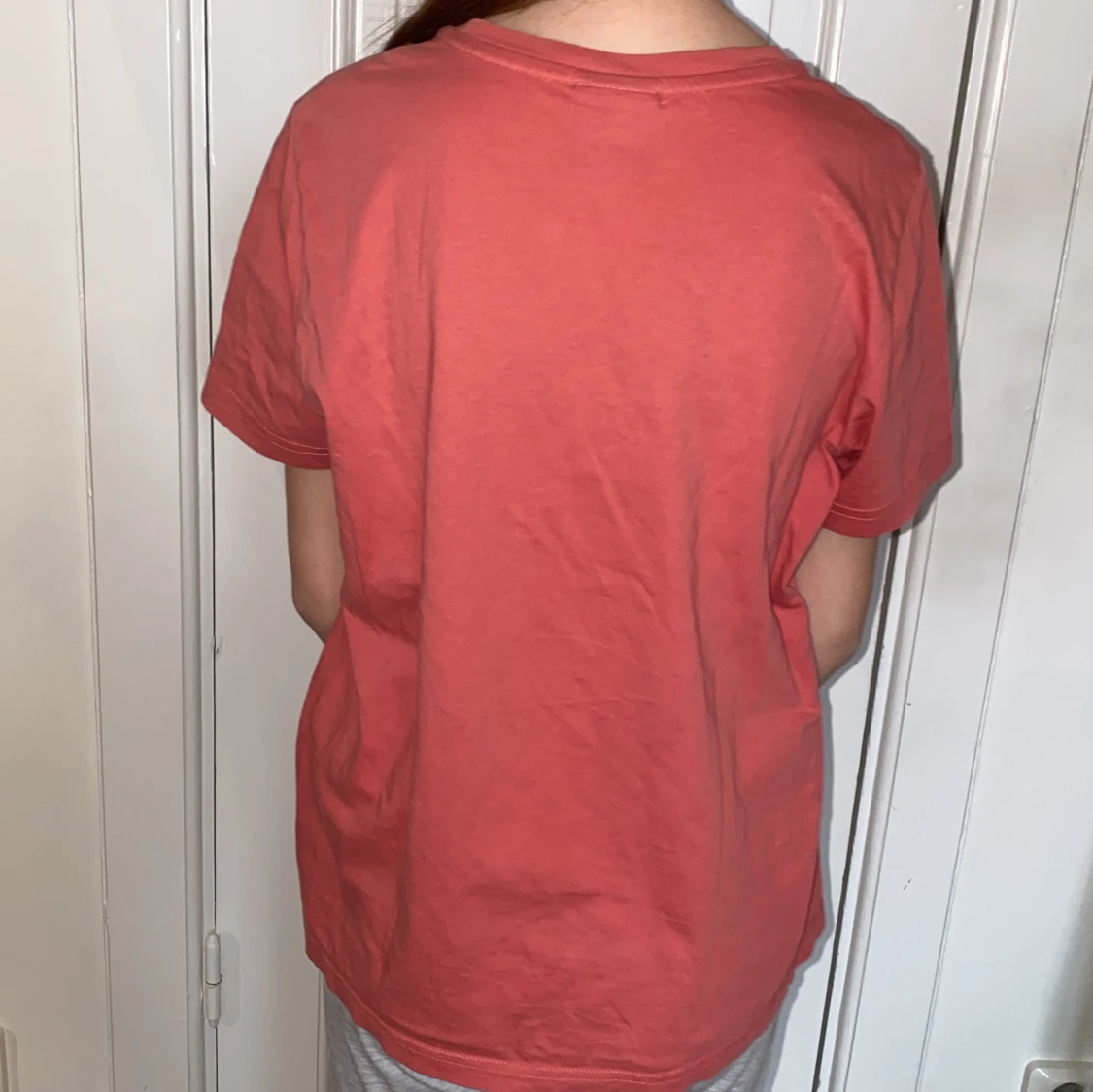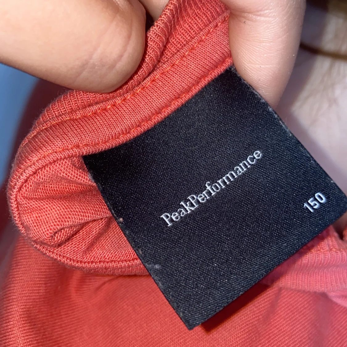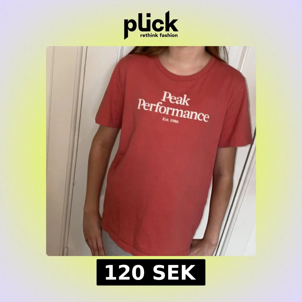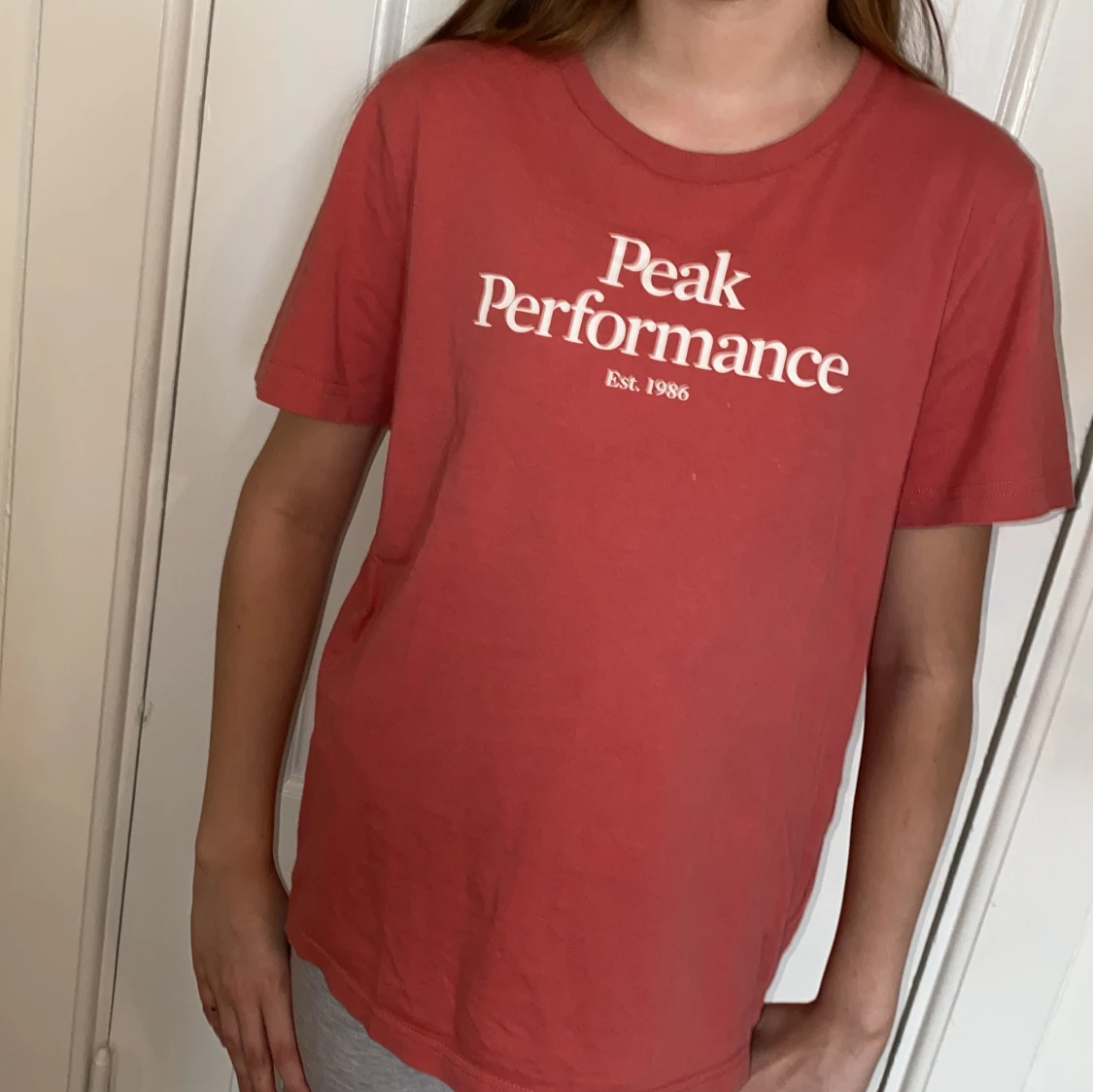 Säljer en röd/orange t-shirt från Peak Performance med vit logga framtill. T-shirten har rund halsringning och är tillverkad i mjuk bomull. Perfekt basic-plagg med normal passform och korta ärmar.