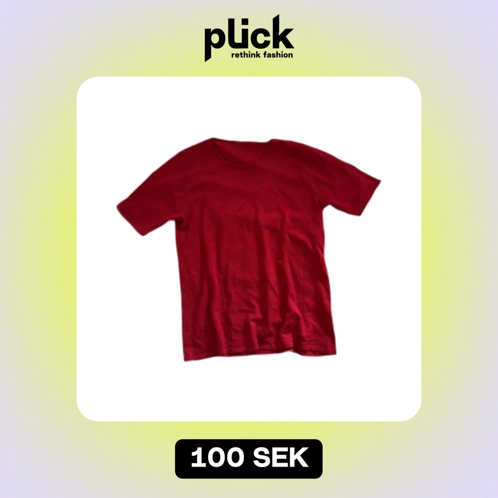 Röd kortärmad tshirt, lite hårdare material, står ingen storlek uppskattas till S-M