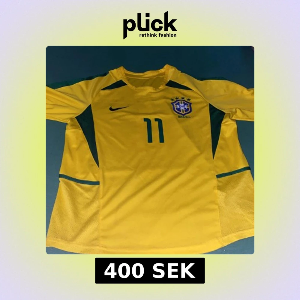 Säljer en gul Brasilien fotbollströja från Nike med nummer 11 och texten 'Ronaldinho' på ryggen. Tröjan är kort ärmat och det brasilianska fotbollsförbundets emblem på bröstet. Perfekt för fotbollsfans! Tröjan är riktigt fin för sommaren och har bra kvalité.