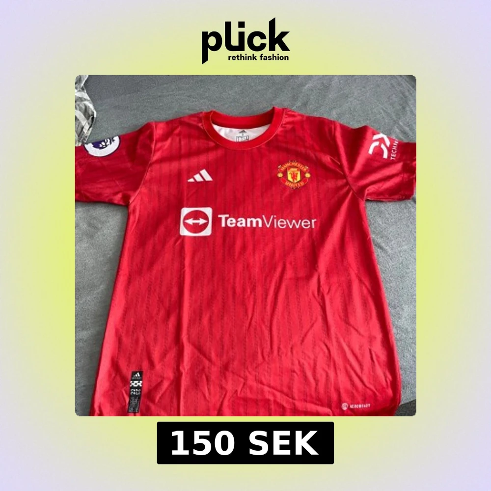 Säljer en röd Manchester United matchtröja med Ronaldo 7 på ryggen. Tröjan har vita detaljer, klubbmärke på bröstet och TeamViewer sponsortryck. Klassisk design med korta ärmar och Adidas-logga. Perfekt för fans!