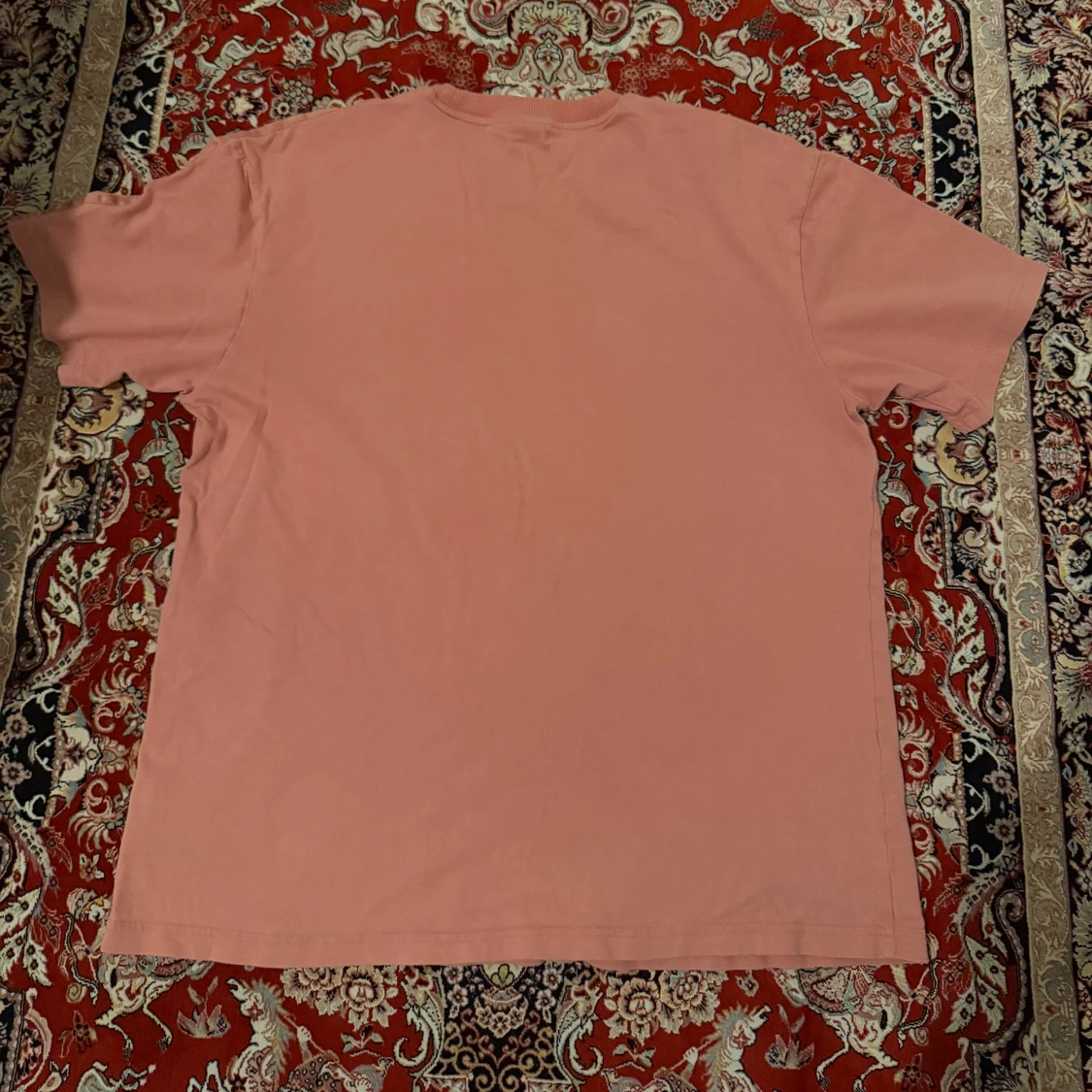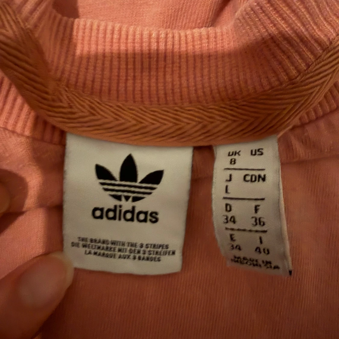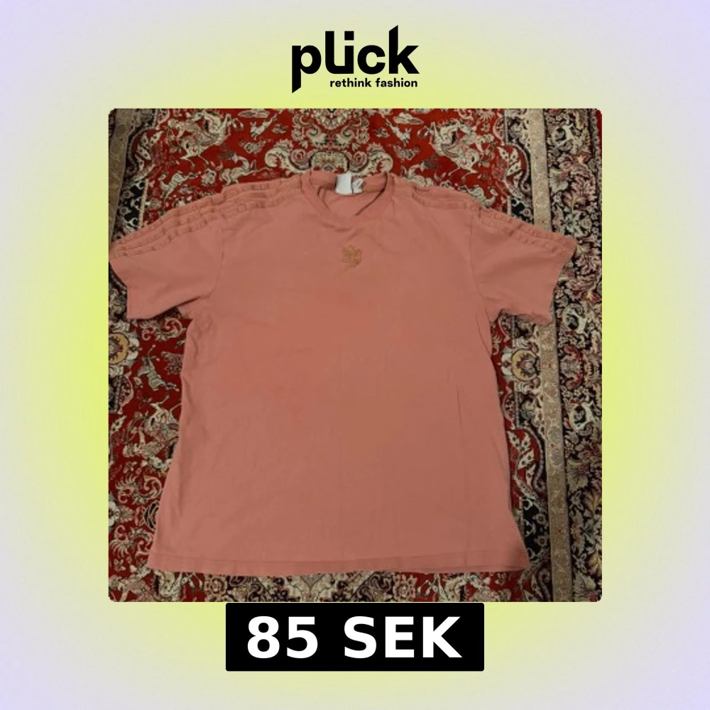 Säljer en snygg rosa t-shirt från Adidas med broderad trefoil-logga på bröstet och klassiska ränder på axlarna. T-shirten är i mjuk bomull och har en relaxed fit med korta ärmar och rund hals. Perfekt för en chill och sportig look.