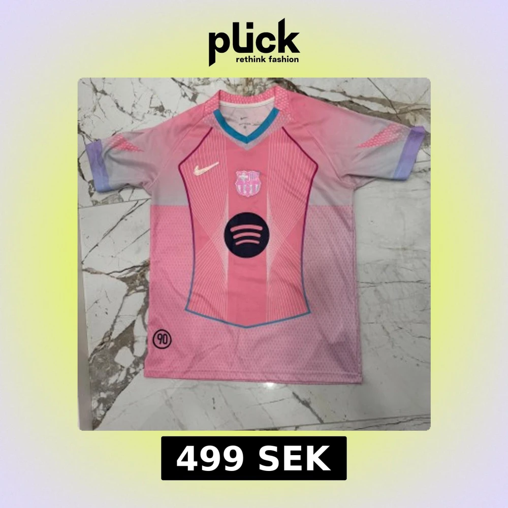 Snygg FC Barcelona fotbollströja från Nike i rosa och lila toner med vita detaljer. Tröjan har korta ärmar, V-ringad krage med blå kant och tryckta loggor från både Nike och Spotify. Tillverkad i lätt och ventilerande Dri-FIT-material. Storlek L men passar en lite större M