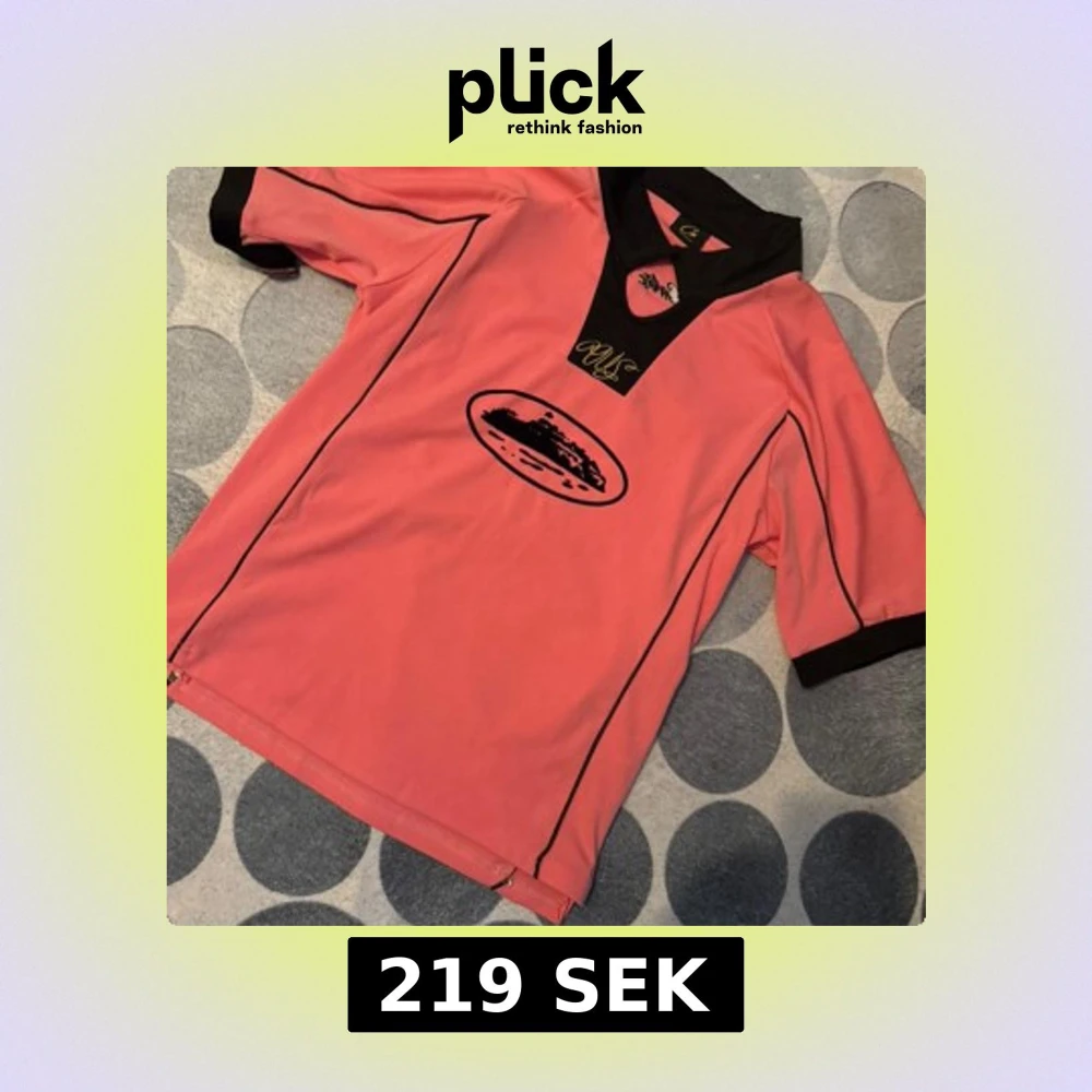 Säljer en rosa fotbollströja med svart krage och svarta detaljer. Tröjan har korta ärmar och ett tryckt motiv på bröstet. Tillverkad i ett lätt och sportigt material som passar perfekt för träning eller match.