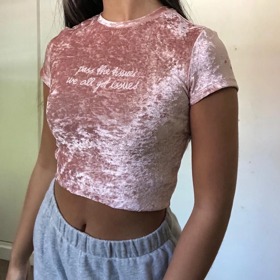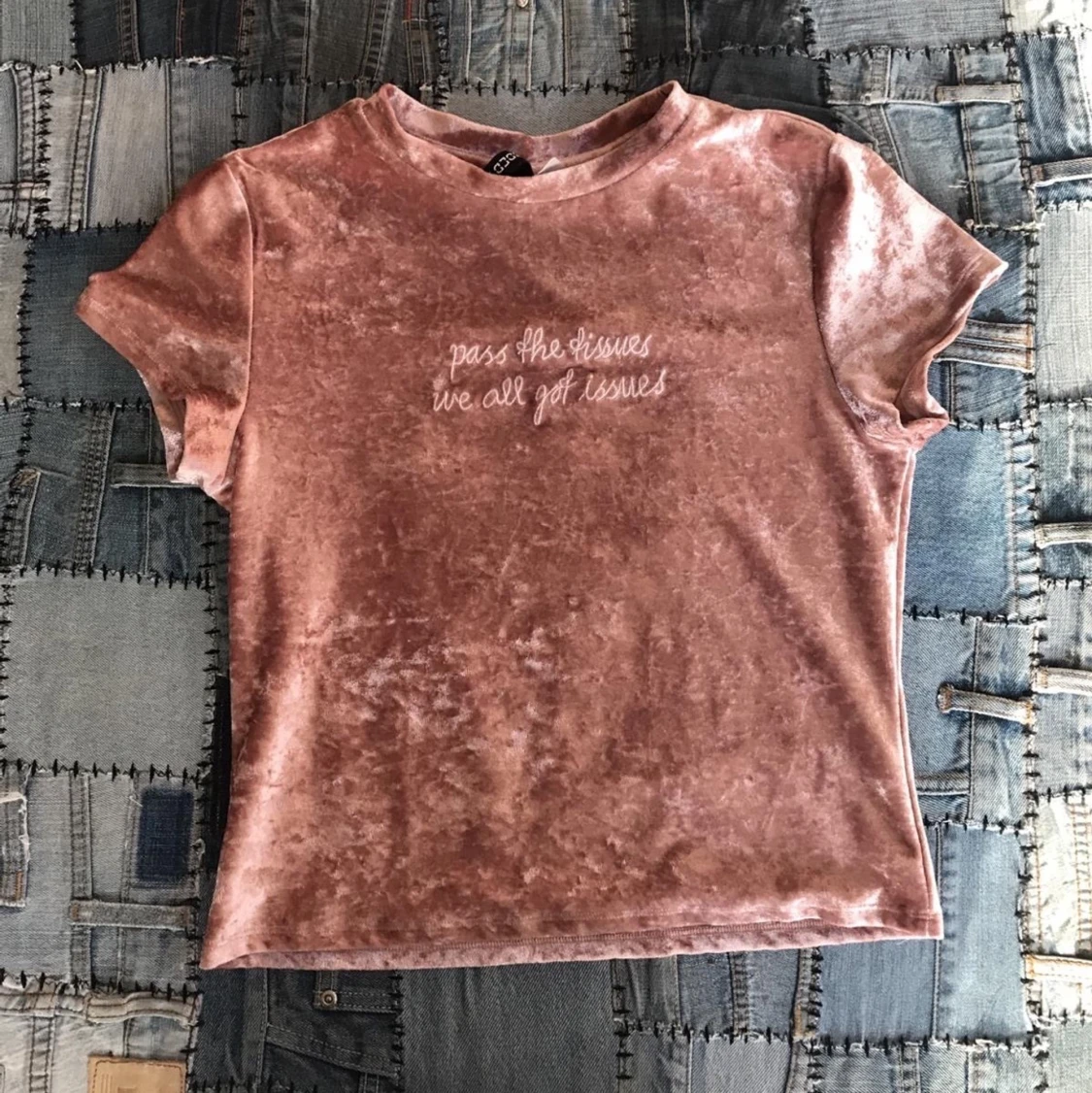 Sjukt snygg rosa topp i krossad sammet/velvet/velour ifrån H&M i strl XS! Trycket lyder följande; ”Pass the tissues, we all got issues” I princip aldrig använd och är därmed i mycket bra skick🥰