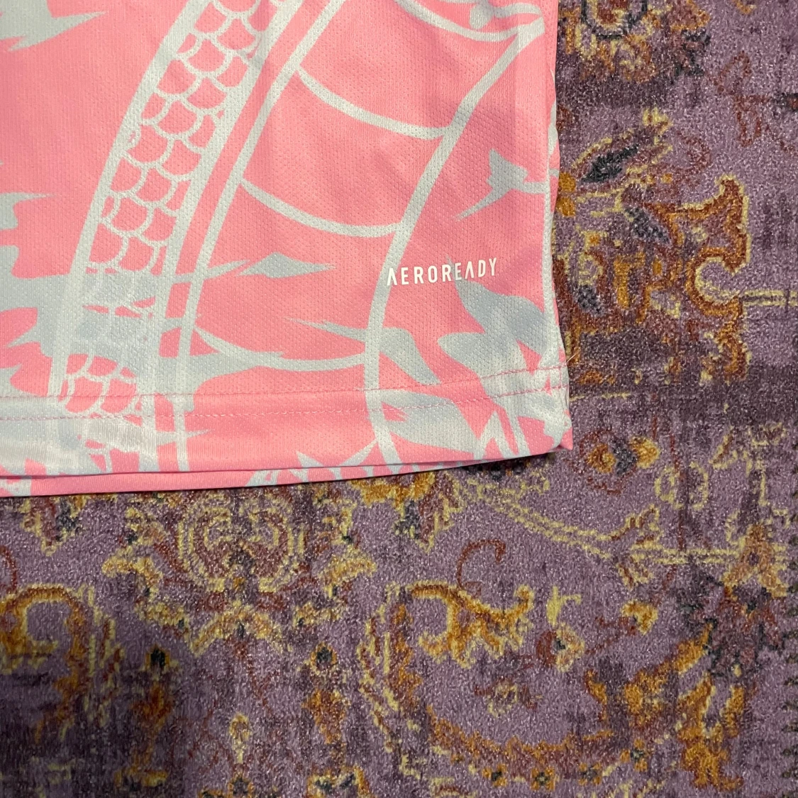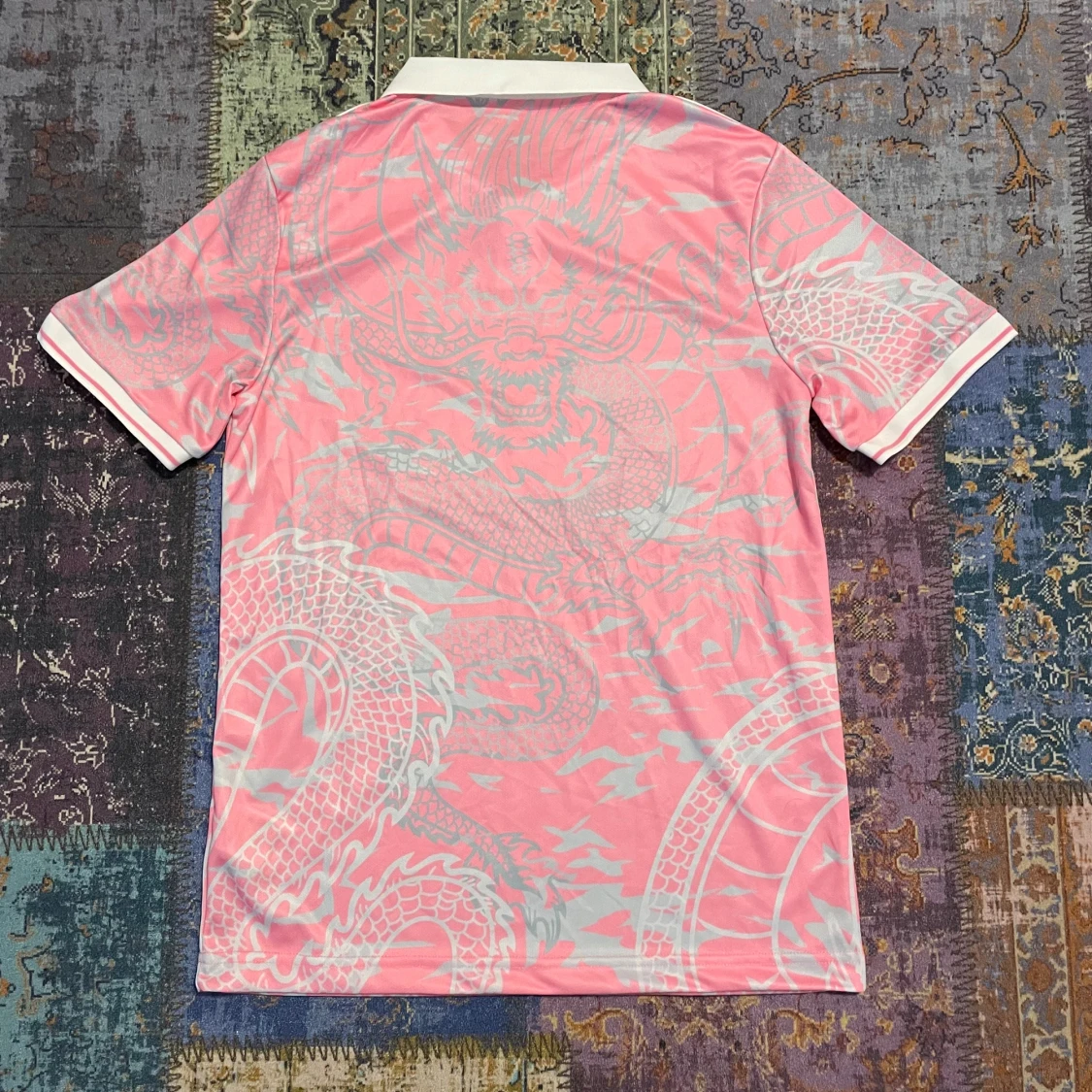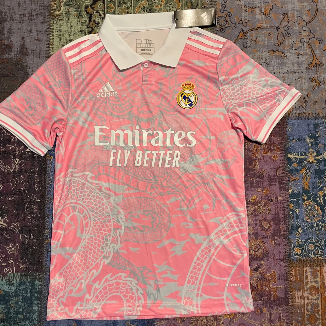 Snygg rosa Real Madrid fotbollströja med drakmönster i ljusgrått. Tröjan har en vit krage och korta ärmar med vita detaljer. Tillverkad med AEROREADY-teknologi för optimal komfort. Priset kan diskuteras!