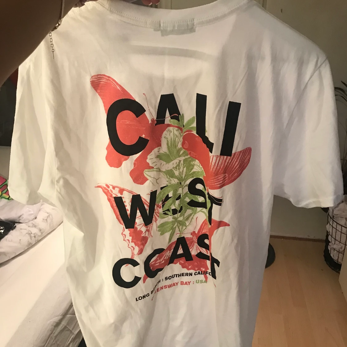 En vit graphic t-shirt med rosa tryck. Aldrig andvänd, fick hem den idag men passade inte så som jag önskade så den är i nyskick. Om du vill ha fler bilder eller undrar något mer skicka privat. Om fler är intresserade blir det bud💕