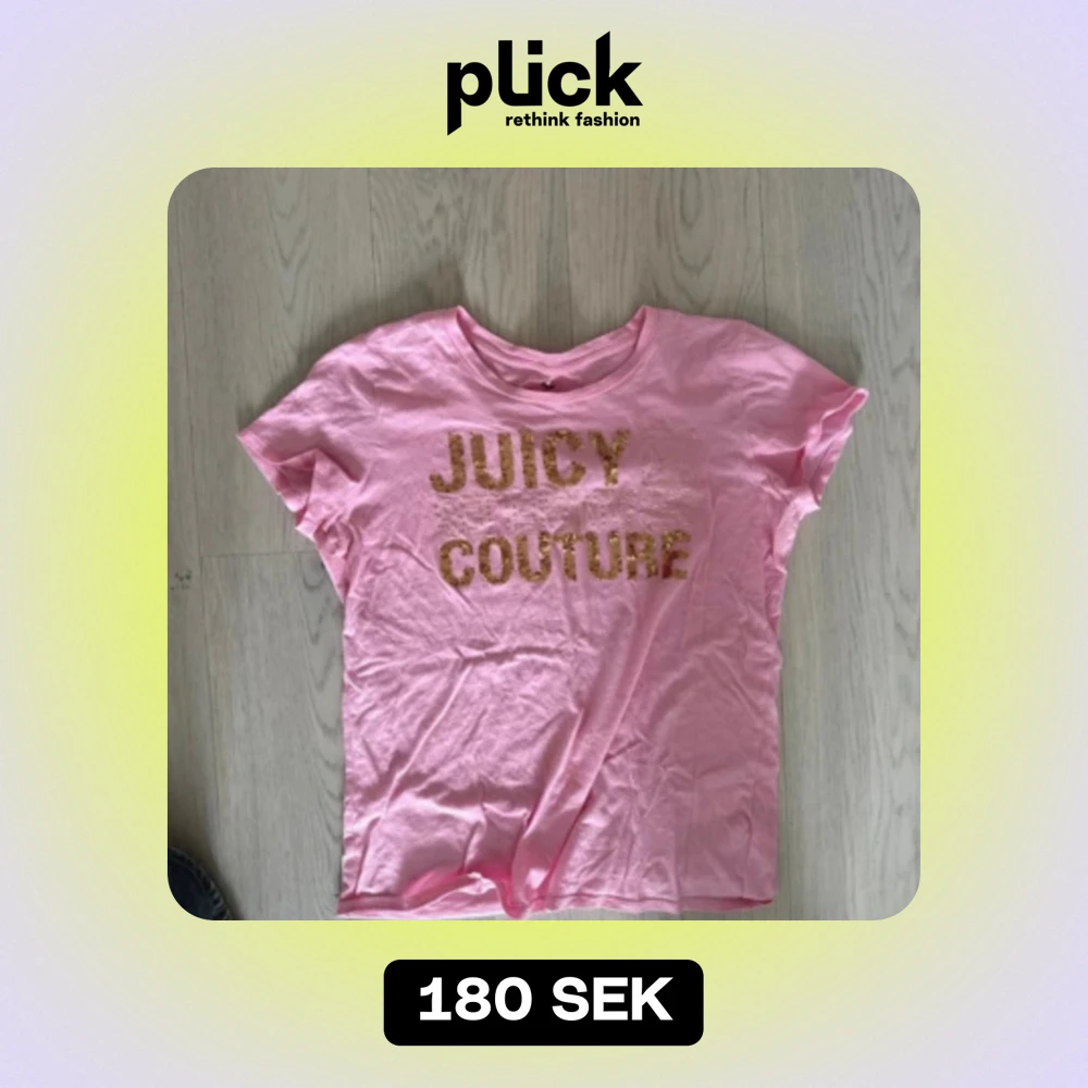 Säljer en superfin rosa t-shirt från Juicy Couture. Den har korta ärmar och ett glittrigt guldtryck med märkesnamnet på framsidan. Perfekt för en avslappnad men ändå stilren look. T-shirten är i bomull och känns riktigt skön mot huden.