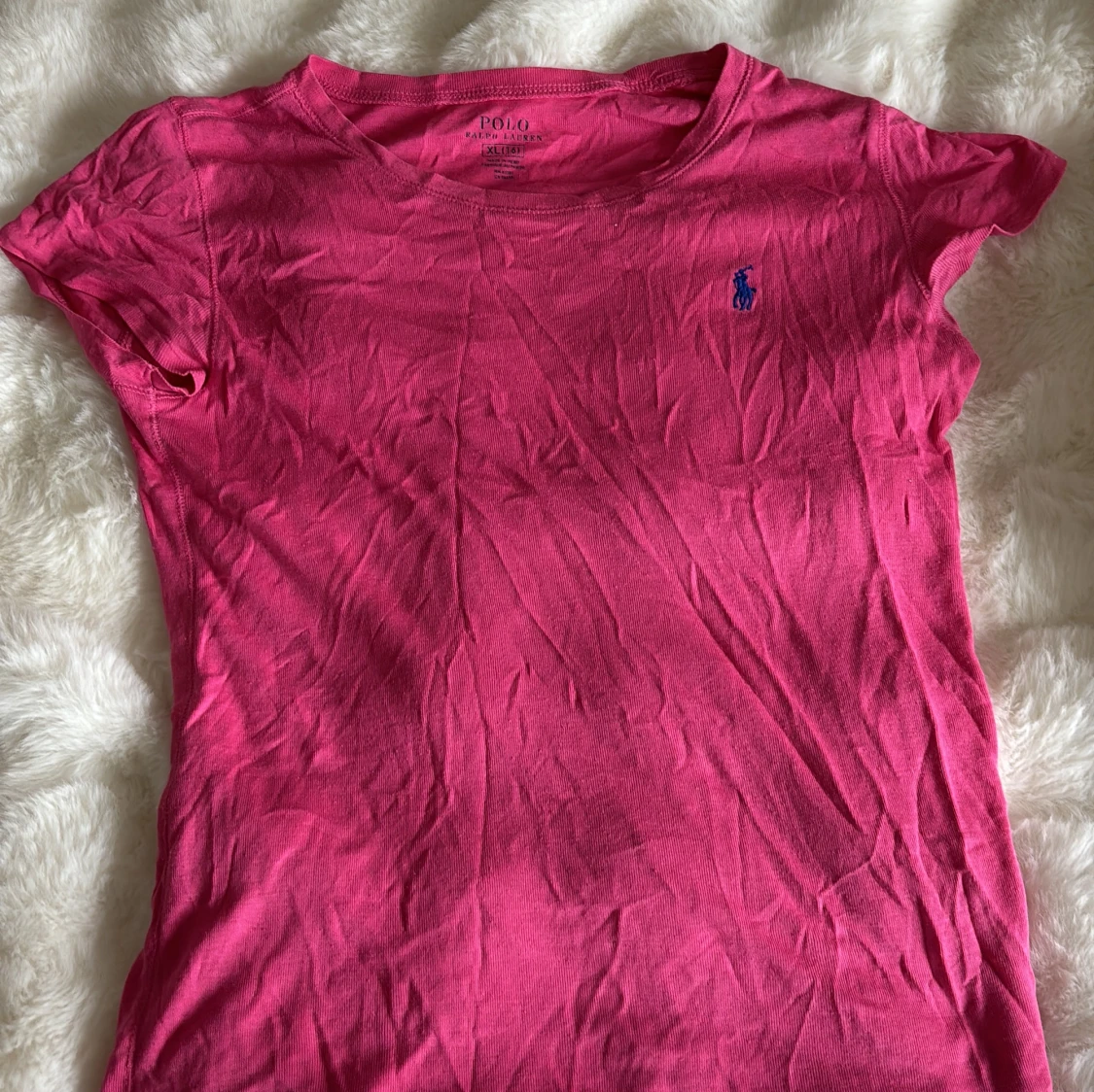 Säljer en rosa t-shirt från Polo Ralph Lauren i bomull. Modellen är klassisk med rund halsringning och korta ärmar. På bröstet finns den ikoniska blå broderade loggan. Perfekt för en chill och stilren look.