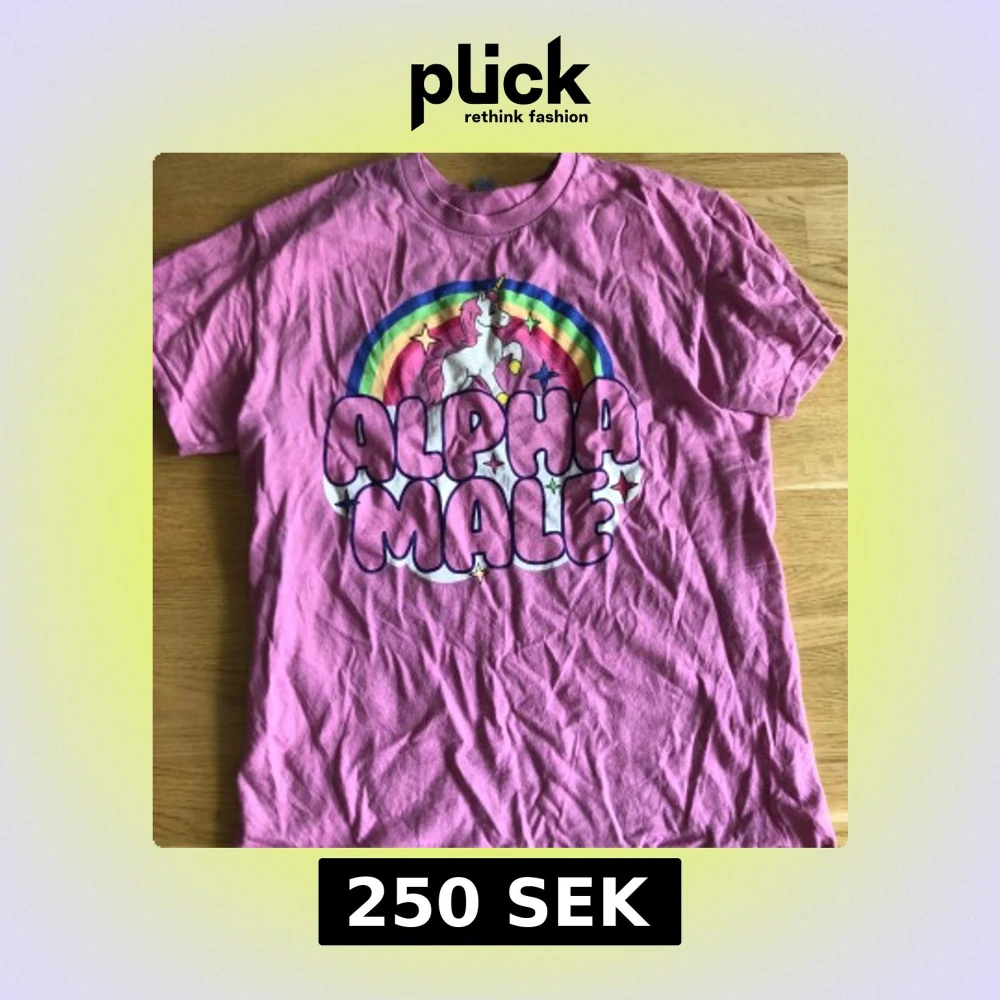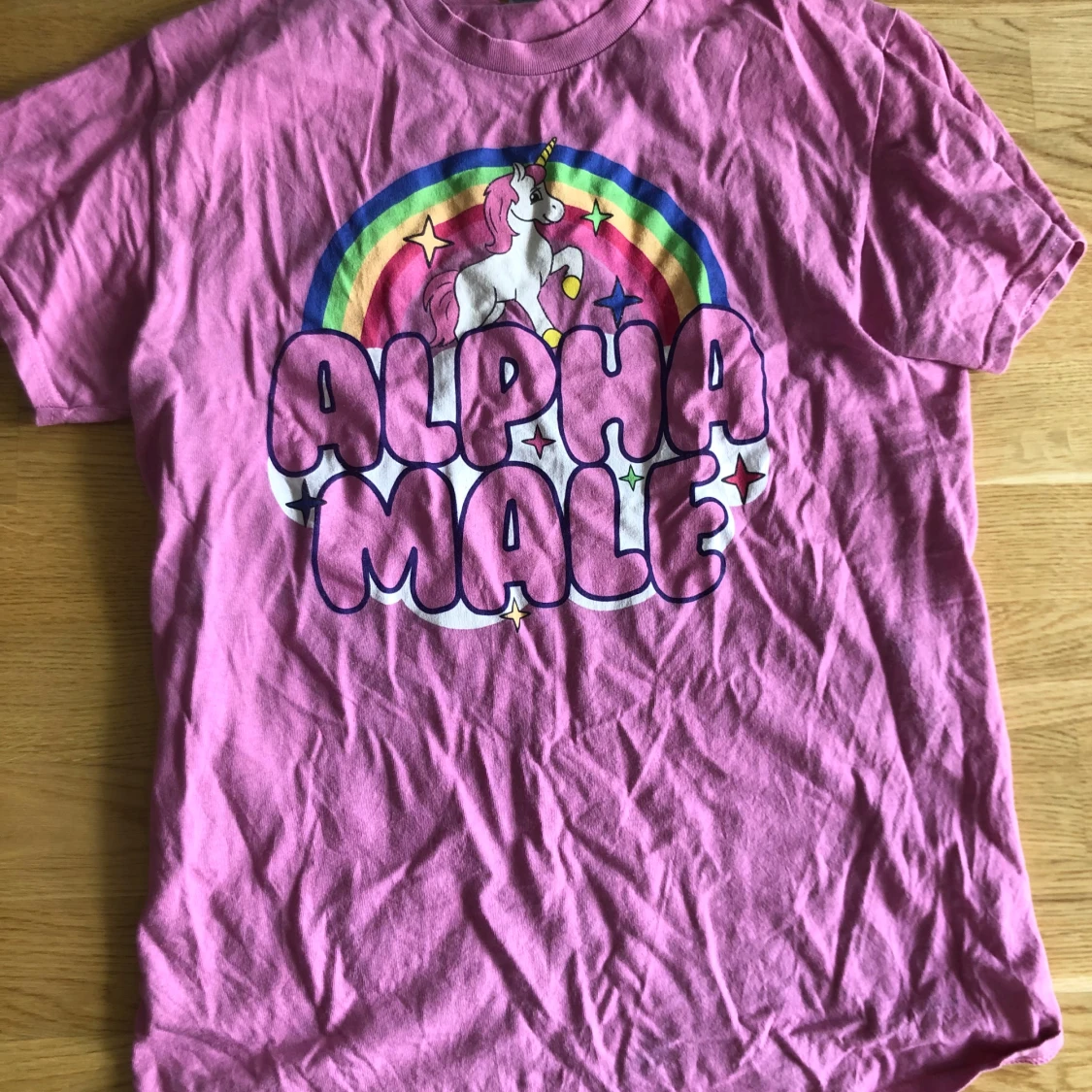 Rosa t-shirt med coolt tryck av en enhörning, regnbåge och texten 'Alpha Male' i stora bubbelbokstäver. Färgglada detaljer och stjärnor gör den extra unik. Perfekt för dig som gillar statement-plagg och lekfull stil.