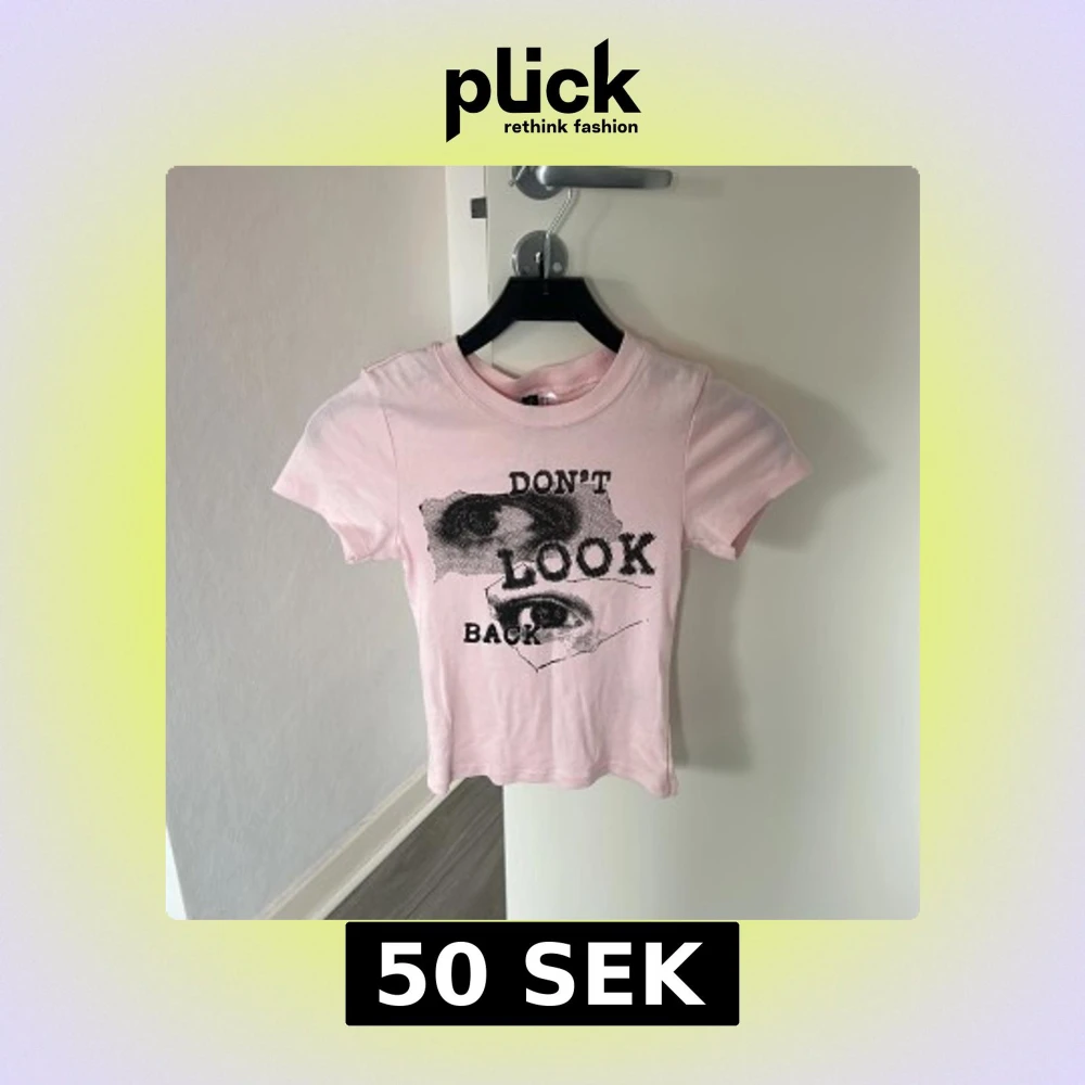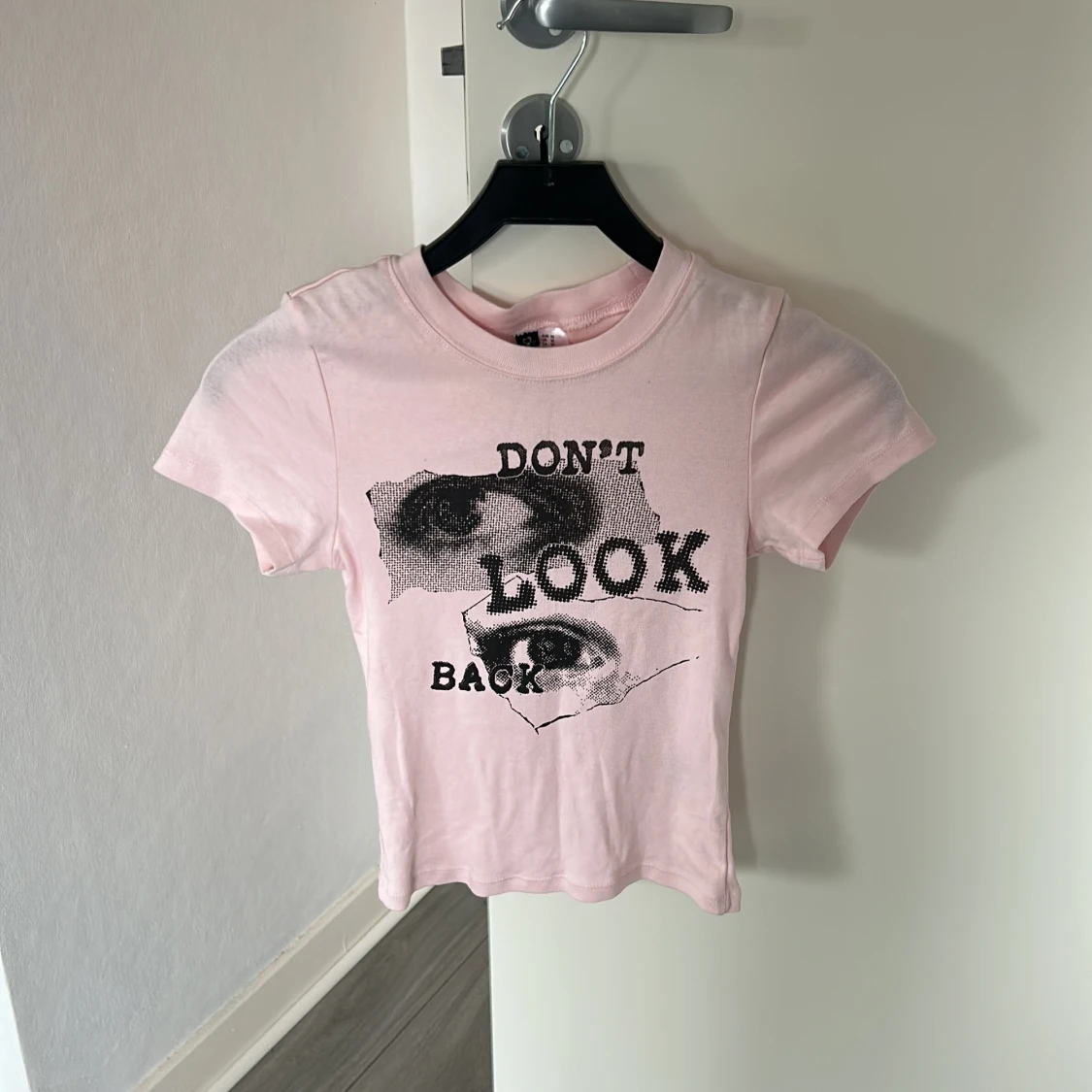 Snygg ljusrosa t-shirt med coolt svart tryck och texten 'Don't Look Back' på framsidan. Modellen är croppad och har rund hals samt korta ärmar. Perfekt för dig som gillar statement-plagg och streetstyle.