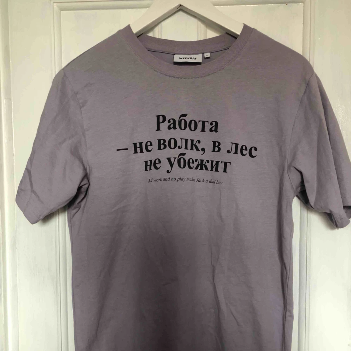 Lila tröja med rysk text från weekday. Tröjan är knappt använd, som ny! Det står storlek XS men den passar gott en S med! Köpare står för frakt!