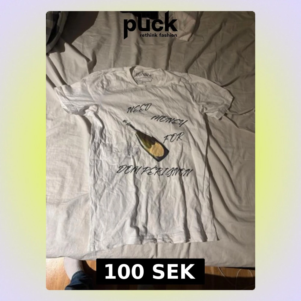 Vit t-shirt från Monroe med trycket 'Need money for Dom Perignon' och en illustration av en champagneflaska. Klassisk passform och rund hals. Perfekt för dig som gillar statement-plagg och vill sticka ut.