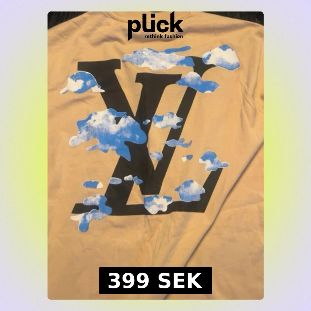 Snygg beige t-shirt med stort L..Vtryck täckt av blåvita moln på ryggen och mindre tryck framtill. Klassisk passform och rund hals. Perfekt för dig som vill sticka ut med en unik design.