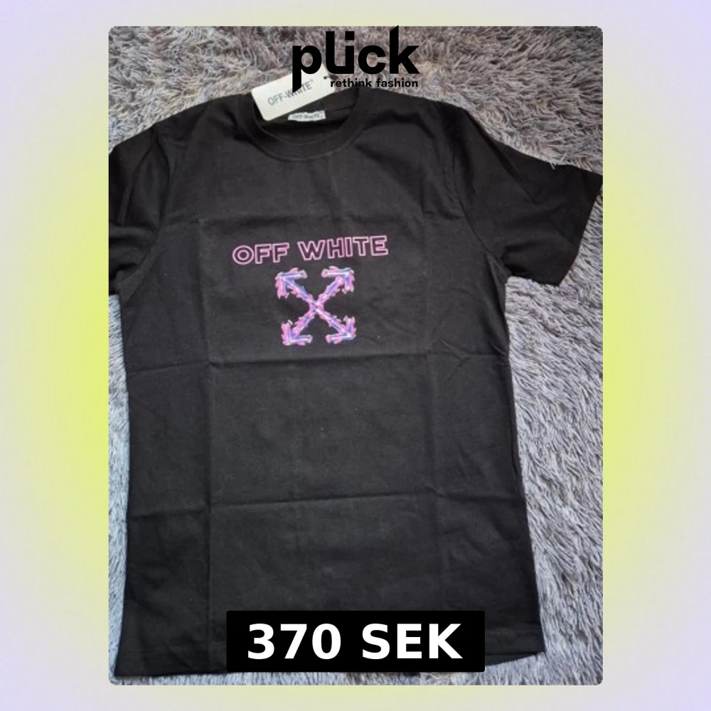 Svart t-shirt från Off-White med färgstarkt grafiskt tryck fram och bak. Framsidan har rosa och lila Off-White-logga och pilar, medan baksidan har en stor graffiti-inspirerad figur och samma pilar. Klassisk rund hals och korta ärmar.