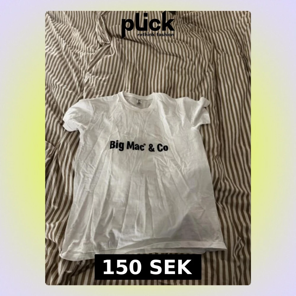 Säljer en vit t-shirt med svart text 'Big Mac & Co' på framsidan och ett coolt tryck med '85 kr' i rött och vitt på ryggen, från Mcdonalds. T-shirten har klassisk rund hals och korta ärmar. Storlek S