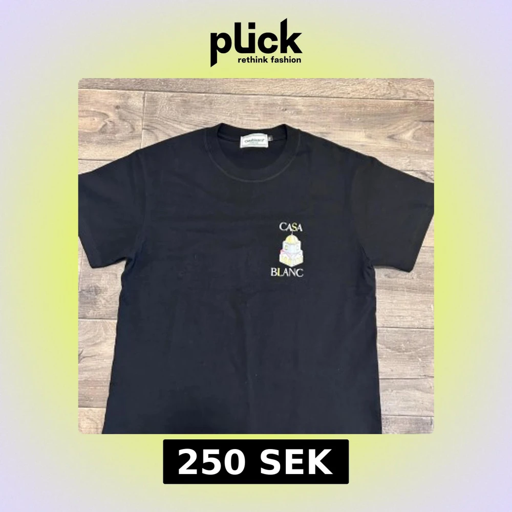 Svart t-shirt från Casablanca med färgglatt tryck på både bröstet och ryggen. Trycket visar texten 'Casa Blanca' och motiv som kamera, byggnad, frukt och blomma. Klassisk rund hals och korta ärmar. Perfekt för dig som gillar unika prints och streetwear.