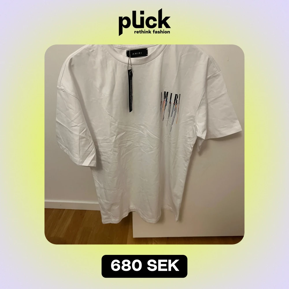 Säljer en snygg vit t-shirt från Amiri i nytt skick. Den har ett coolt tryck med färgglada detaljer både fram och bak. Perfekt för en avslappnad stil eller att klä upp med en jacka. Storleken är normal och materialet känns mjukt och skönt. Loose S