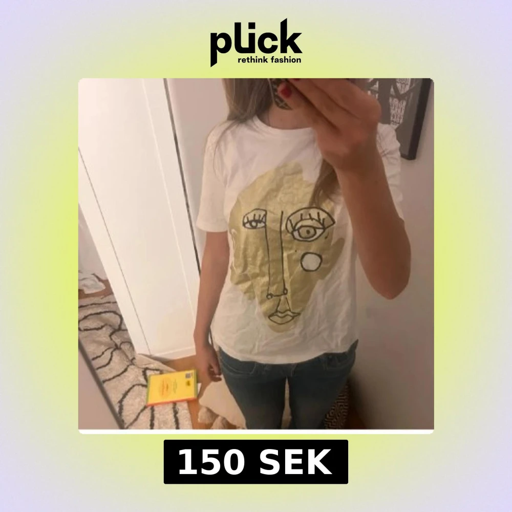 Vit t-shirt med korta ärmar och ett stort konstnärligt tryck av ett abstrakt ansikte i guld och svart på framsidan. T-shirten har en klassisk passform och är gjord i mjukt bomullstyg. Perfekt för dig som gillar unik och trendig stil.