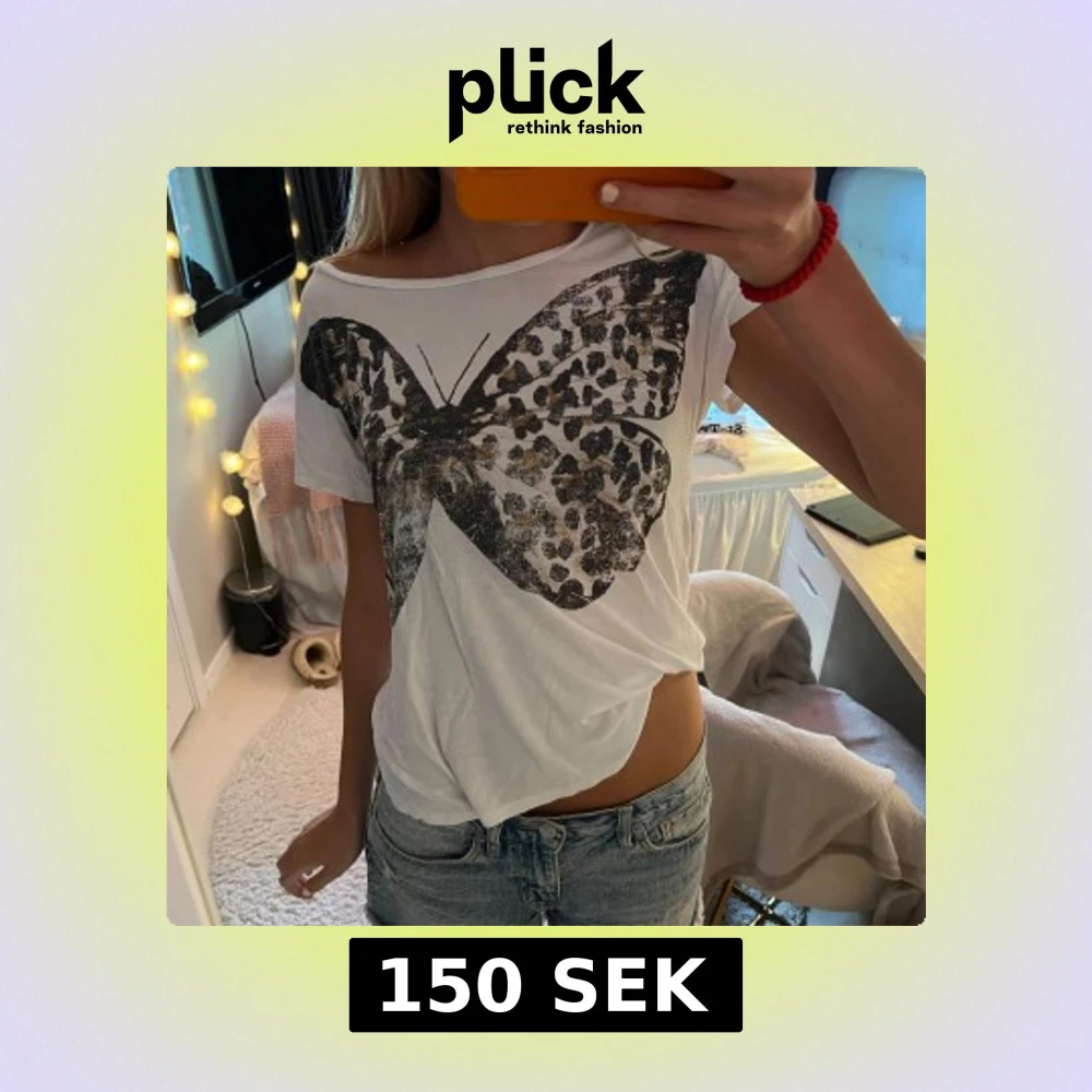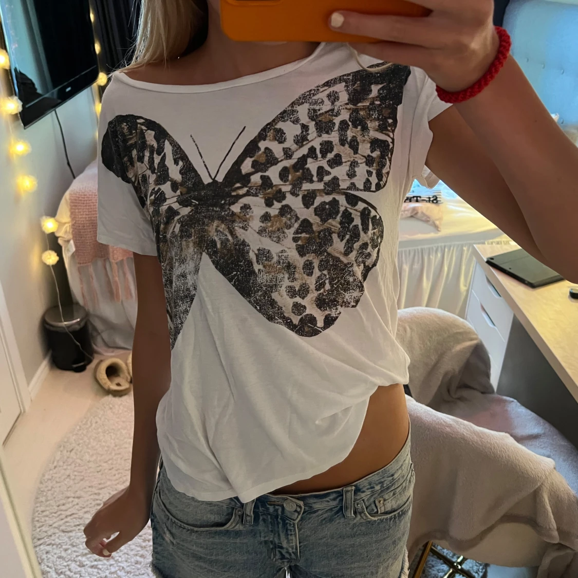 Vit t-shirt med stort tryck av en fjäril på framsidan där vingarna har leopardmönster i svart och bruna toner ifrån Lindex.