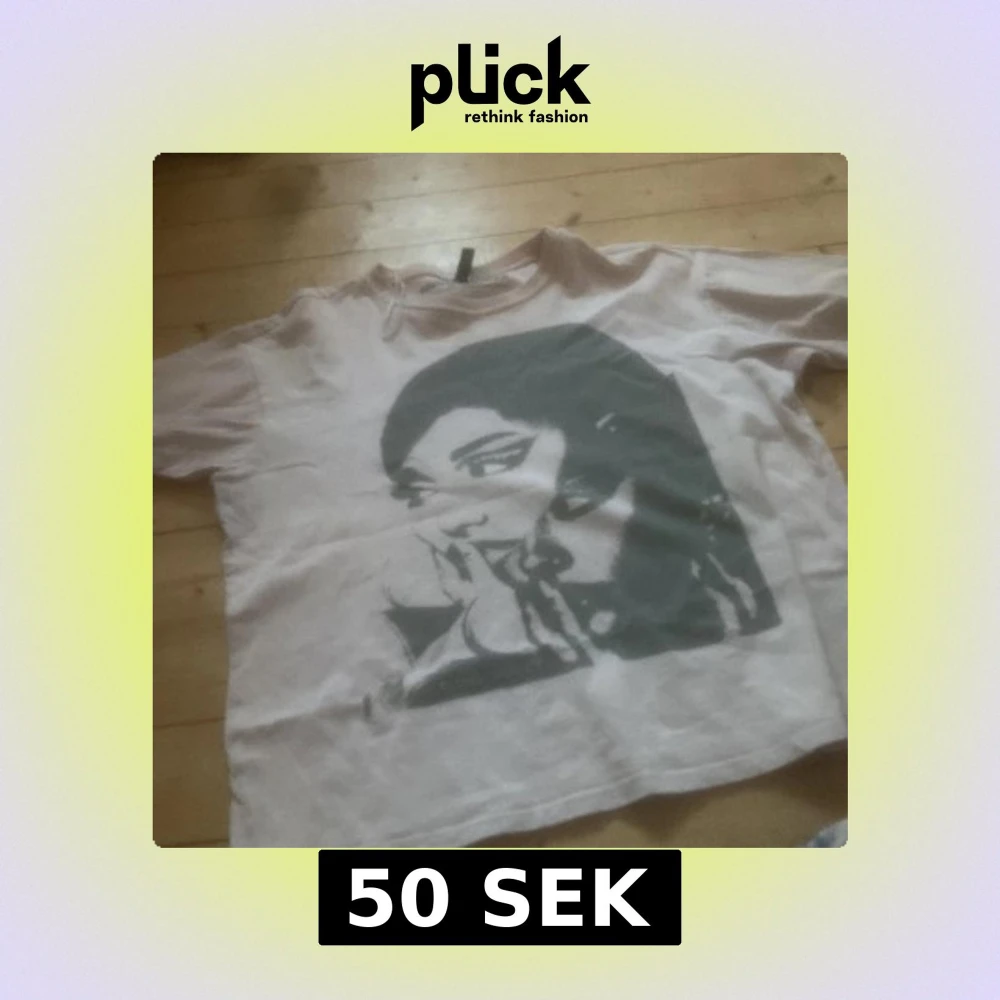 Säljer en vit t-shirt med ett stort tryck av en person på framsidan. T-shirten är kortärmad och har en rund halsringning. Perfekt för fans av Ariana Grande!
