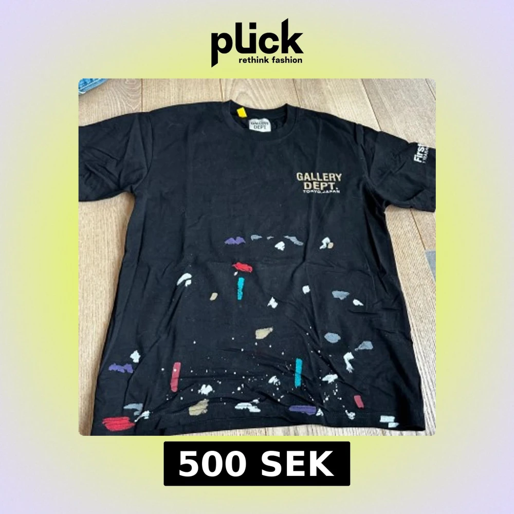 Svart t-shirt från Gallery Dept. Tokyo Japan med tryck på bröstet och färgstänk i rött, blått, lila och beige över framsidan. Klassisk passform med rund hals och korta ärmar. Perfekt för dig som gillar streetwear och unika detaljer.