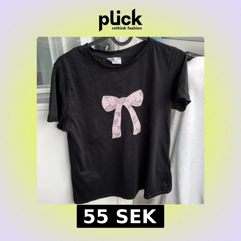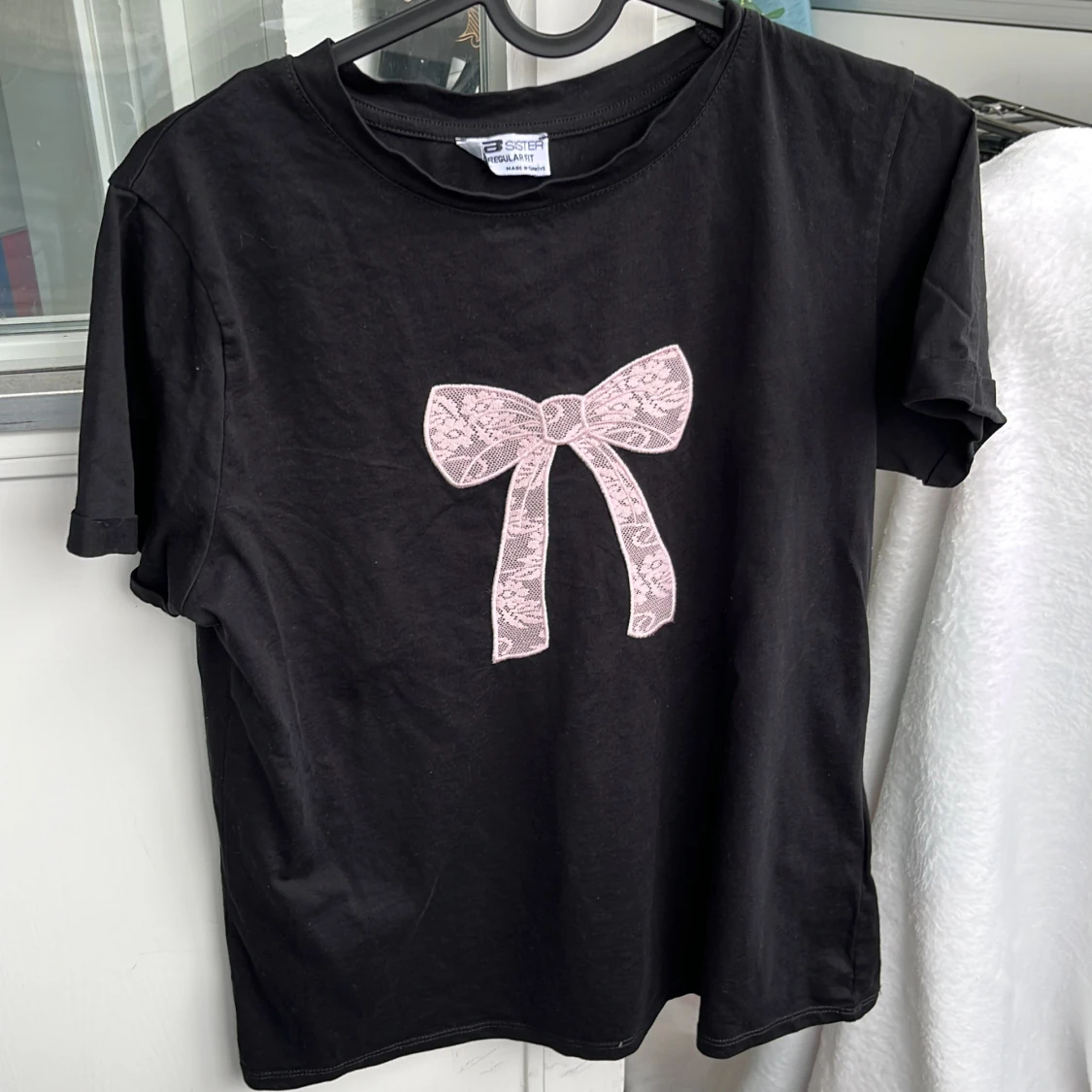 Svart t-shirt med en stor ljusrosa spetsrosett på bröstet. Klassisk rund halsringning och korta ärmar. Perfekt för dig som gillar söta detaljer och enkel stil.