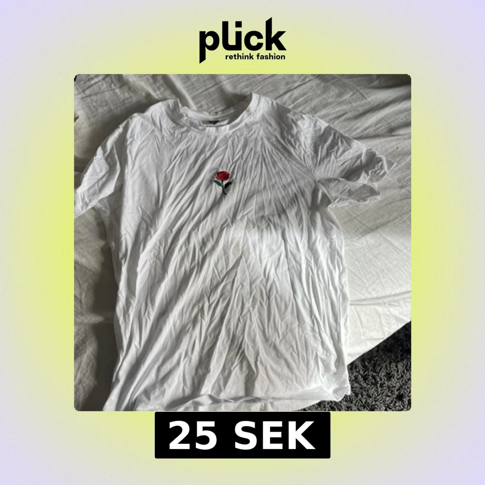 Säljer en vit t-shirt från Shein med en liten broderad ros på bröstet. T-shirten har en klassisk rund hals och korta ärmar. Perfekt för en enkel och stilren look.