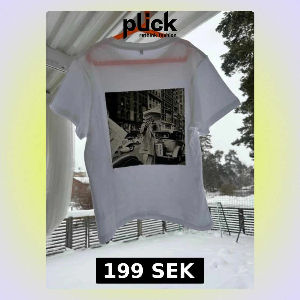Snygg vit t-shirt med ett stort svartvitt retro fototryck på ryggen som ger en cool vintagekänsla. Klassisk rund hals och korta ärmar. Perfekt för dig som gillar streetstyle och vill sticka ut lite extra.