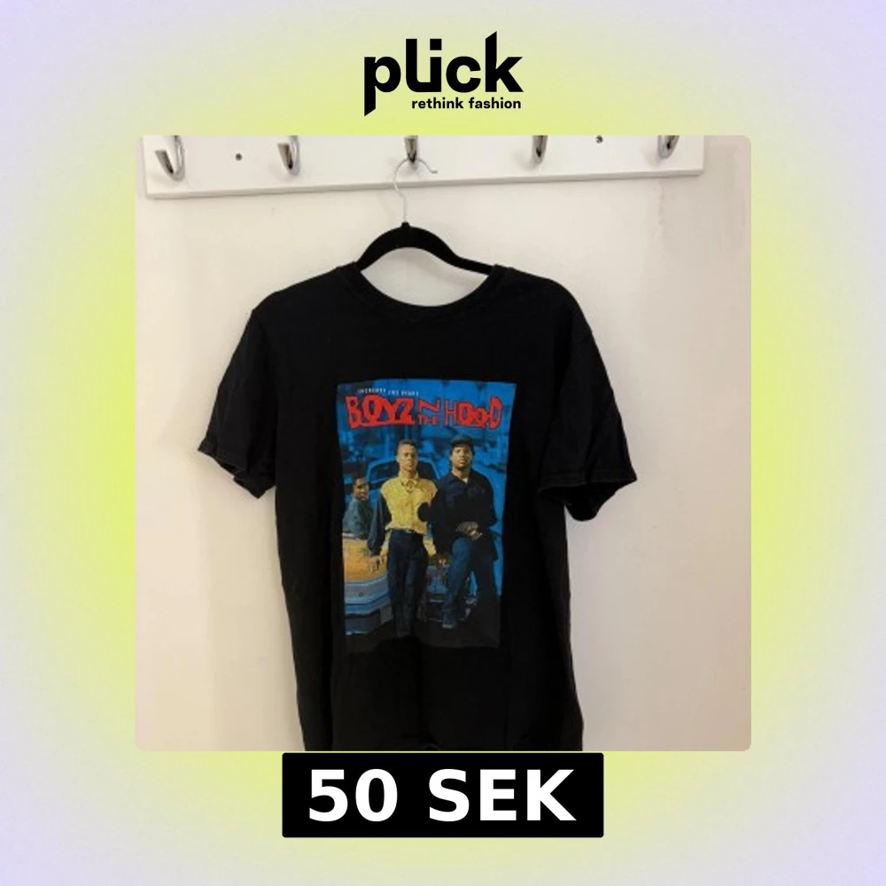 Svart t-shirt med färgglatt Boyz n the Hood-tryck på bröstet. Klassisk passform med rund hals och korta ärmar. Materialet känns som mjuk bomull och motivet har tydliga färger i blått, rött och gult. Perfekt för dig som gillar film och streetstyle.