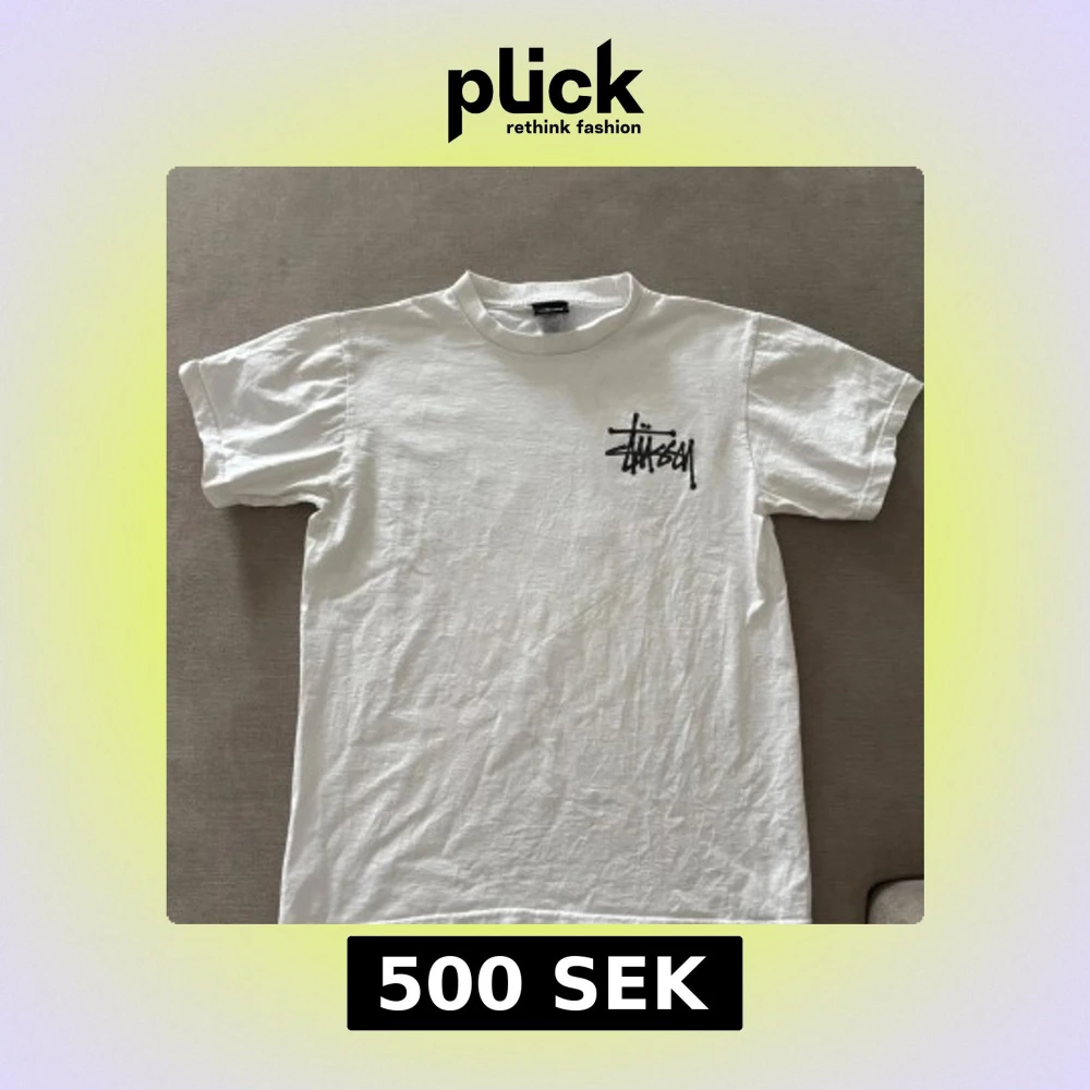 Säljer en klassisk vit t-shirt från Stüssy med svart logga tryckt på bröstet och en stor logga på ryggen. T-shirten har normal passform och är tillverkad i mjuk bomull. Perfekt för en streetwear-look.
