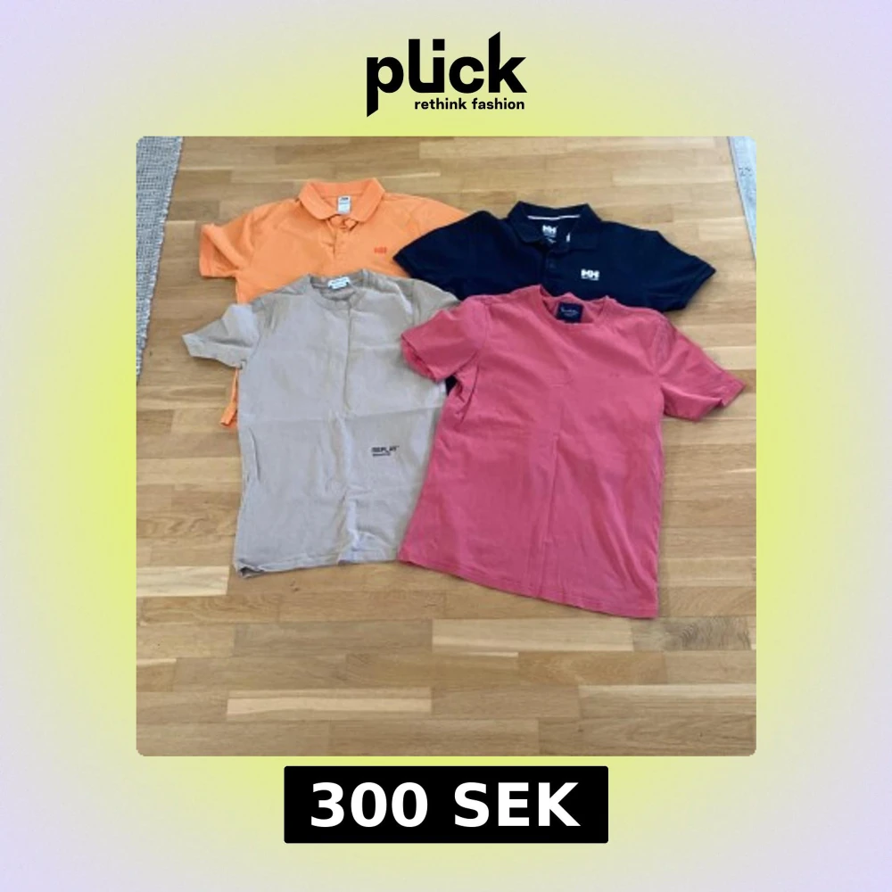 Fyra snygga t-shirts och pikéer: en orange och en marinblå piké från Helly Hansen, en beige t-shirt från Replay och en korallröd t-shirt från Bondelid. Alla är kortärmade och i mjuk bomull, perfekta för alla årstider.Klassiska färger och stilrena! Liten defekt längst ner på Tromsö tröjan men inget synligt!Alla tröjor är i storlek S förutom den orange pikén som är i storlek M!
