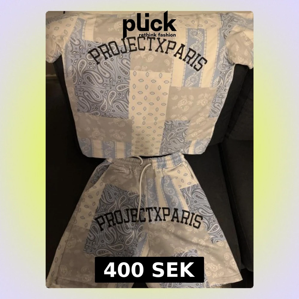 Säljer ett par fräscha shorts från Project X Paris med patchwork paisley-mönster i ljusblått och vitt. De har elastisk midja med snörning och stor logga framtill. Perfekt för dig som gillar streetwear och unik design. Köpt i Spanien för 900kr